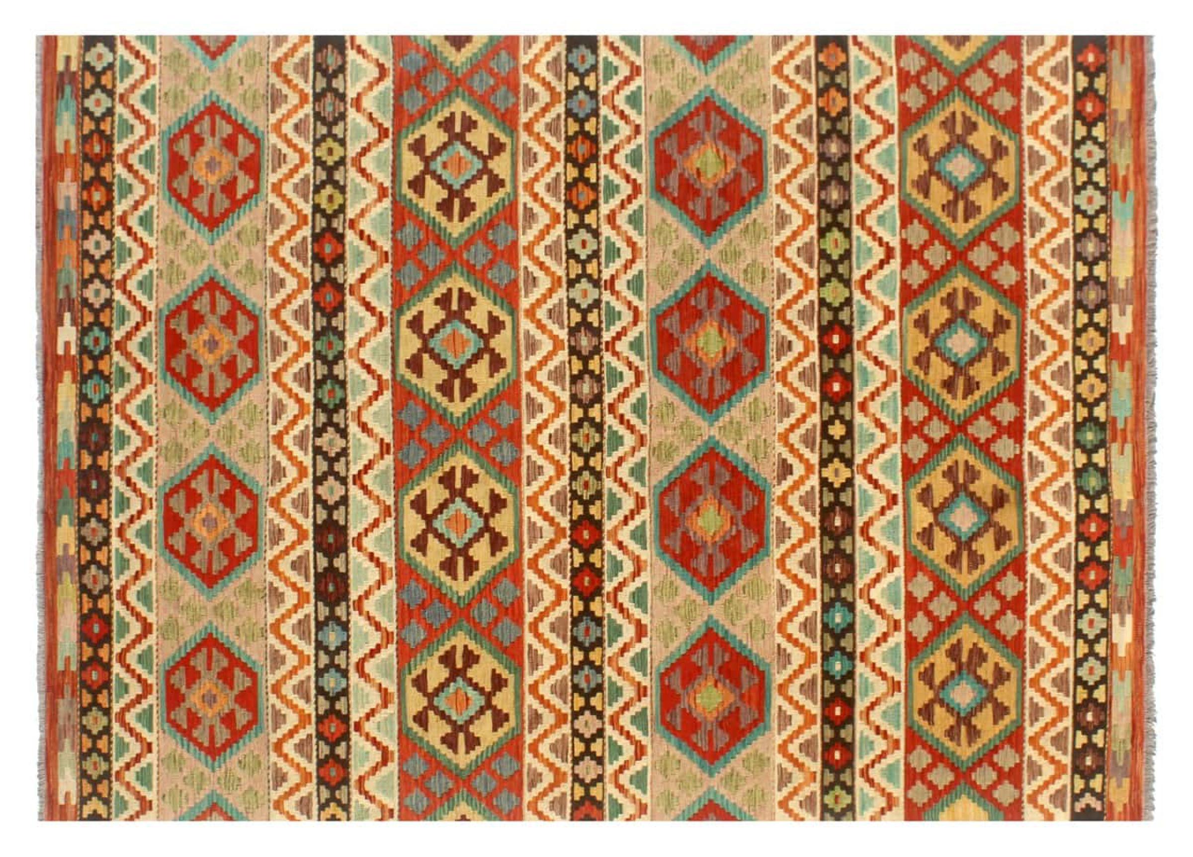 These Kilim rugs have a significant difference from hand-knotted rugs—they are handwoven. As a result, they do not have a high pile of wool and are often flatter and rougher than knotted wool rugs. Their construction is less intricate, making them generally much more affordable. Additionally, Kilim rugs are much lighter and can be laid out on either side. Handwoven Kilims originally come from what was once Persia and are now also widely produced in Afghanistan. They typically feature simple, straight-line patterns, which are characteristic of their weaving technique.