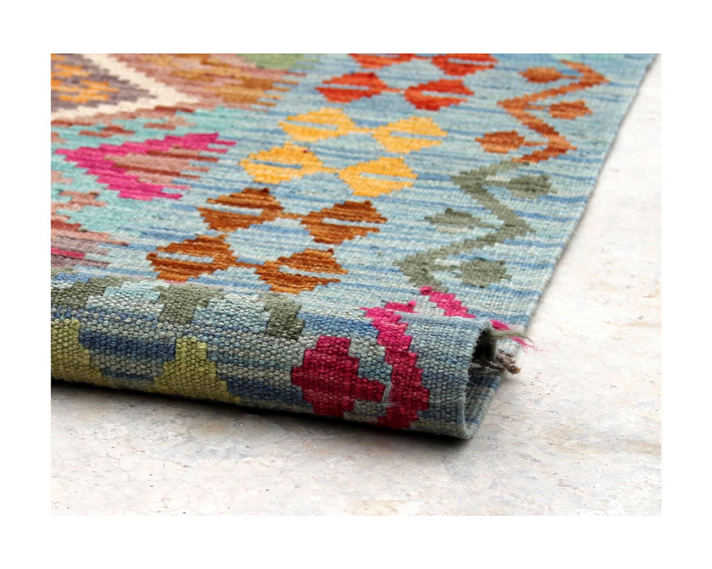 These Kilim rugs have a significant difference from hand-knotted rugs—they are handwoven. As a result, they do not have a high pile of wool and are often flatter and rougher than knotted wool rugs. Their construction is less intricate, making them generally much more affordable. Additionally, Kilim rugs are much lighter and can be laid out on either side. Handwoven Kilims originally come from what was once Persia and are now also widely produced in Afghanistan. They typically feature simple, straight-line patterns, which are characteristic of their weaving technique.