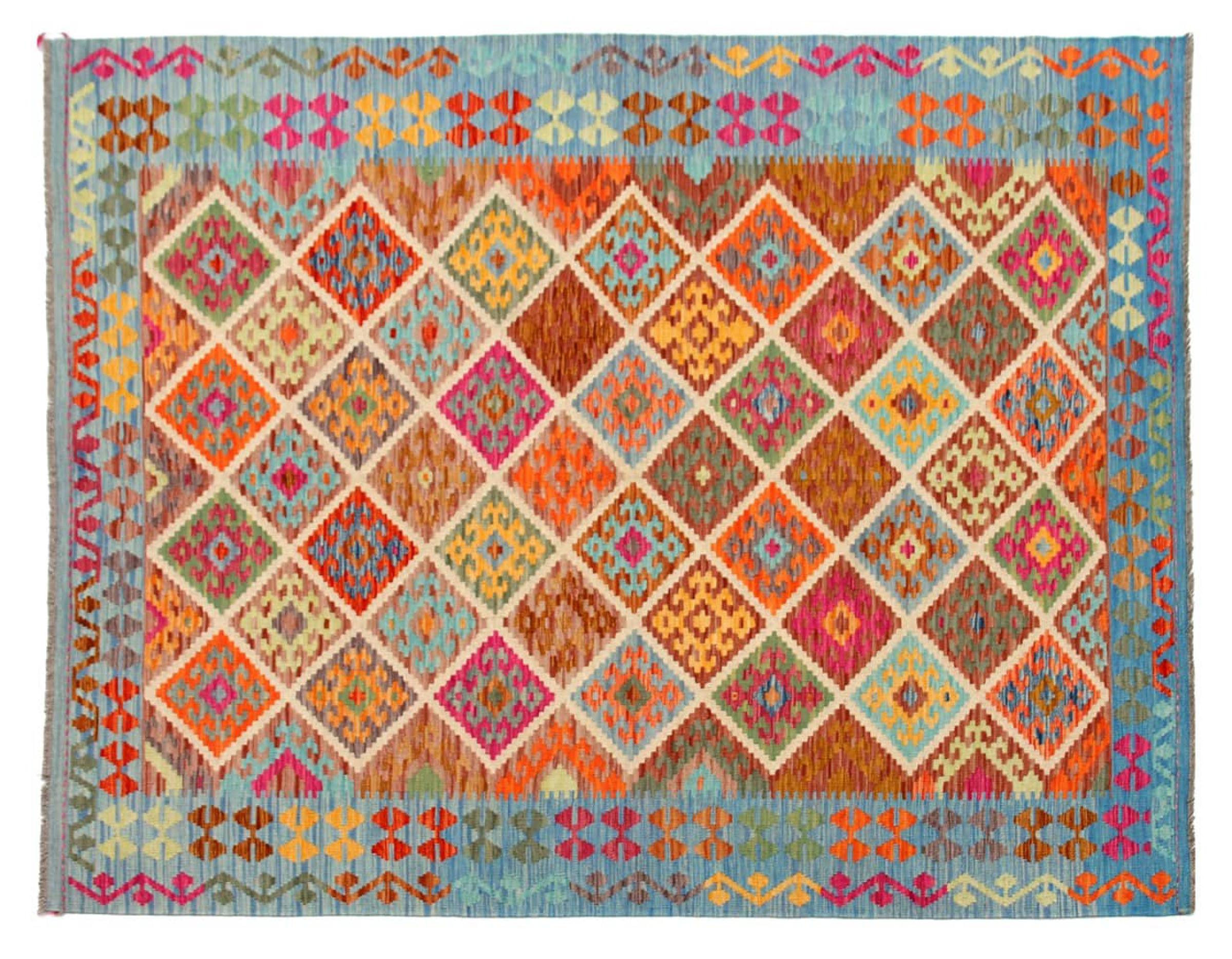 This Kilim Afghan rug has beautiful colors. It is handmade from fine wool. These patterns are traditional design elements that have already been used centuries ago. This particular kilim has been woven by hand in Afghanistan, a country with a long history in weaving and knotting rugs. The rug is robust and can be laid out on both sides.