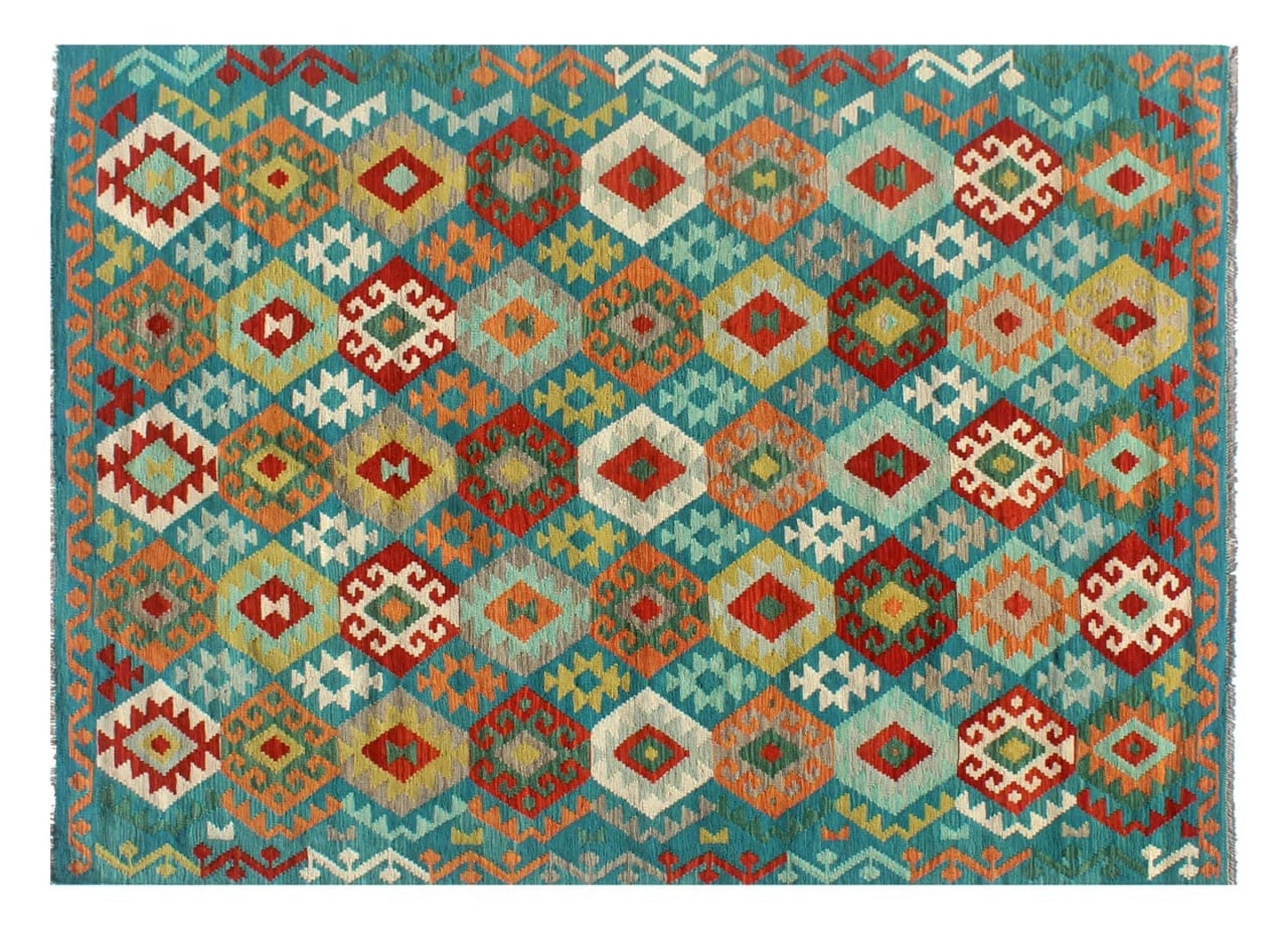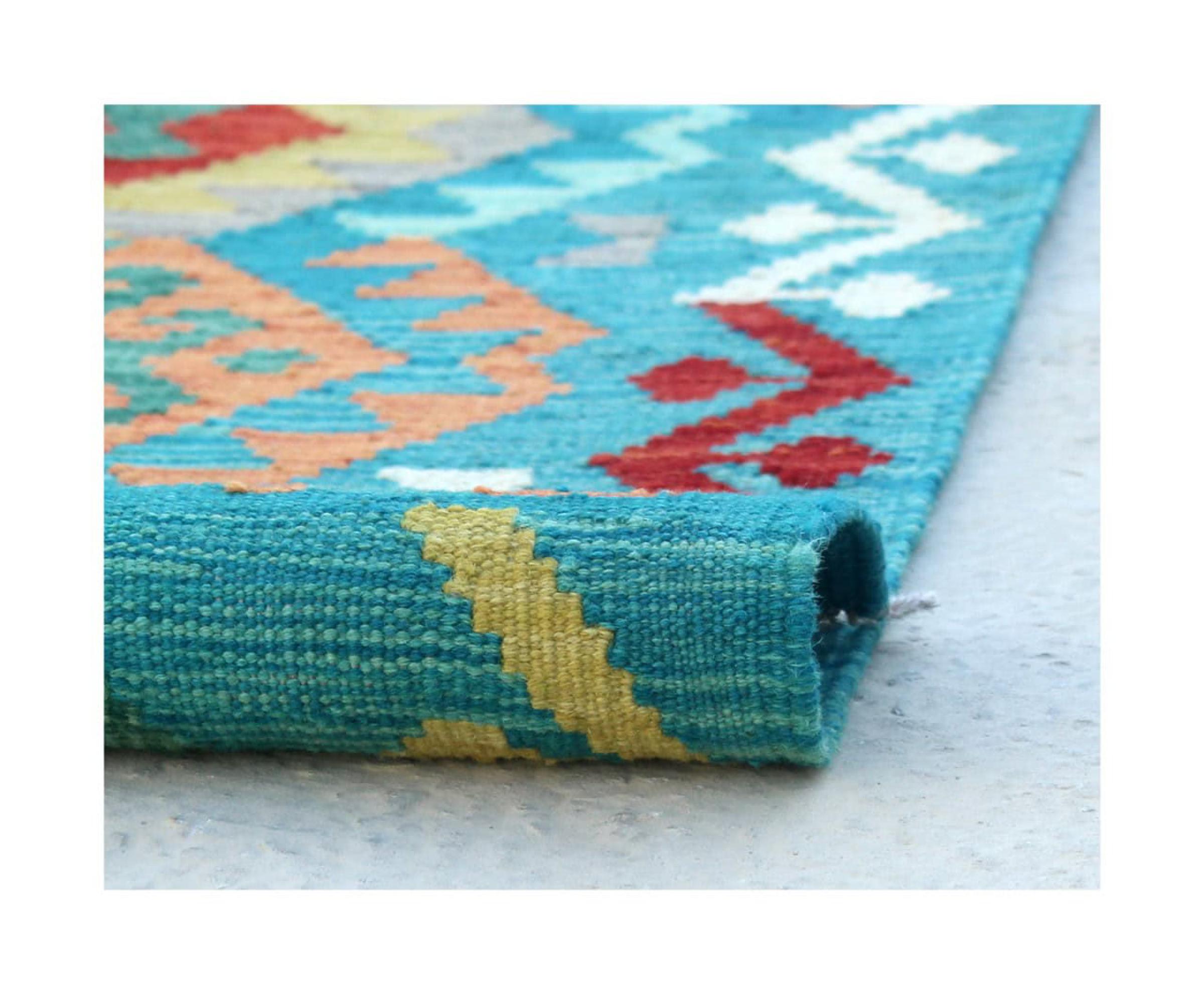 These Kilim rugs have a significant difference from hand-knotted rugs—they are handwoven. As a result, they do not have a high pile of wool and are often flatter and rougher than knotted wool rugs. Their construction is less intricate, making them generally much more affordable. Additionally, Kilim rugs are much lighter and can be laid out on either side. Handwoven Kilims originally come from what was once Persia and are now also widely produced in Afghanistan. They typically feature simple, straight-line patterns, which are characteristic of their weaving technique.