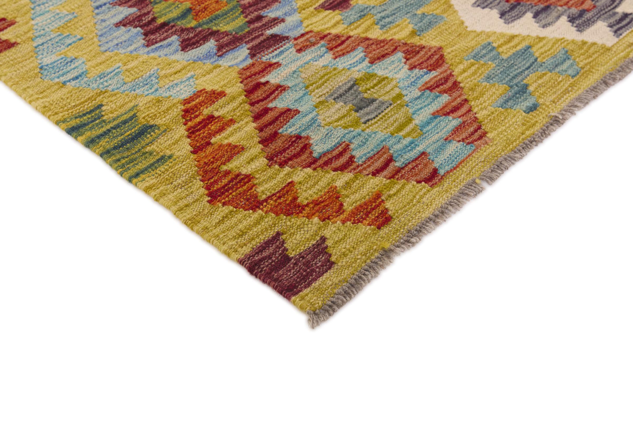 This Kilim Afghan rug has beautiful colors. It is handmade from fine wool. These patterns are traditional design elements that have already been used centuries ago. This particular kilim has been woven by hand in Afghanistan, a country with a long history in weaving and knotting rugs. The rug is robust and can be laid out on both sides.