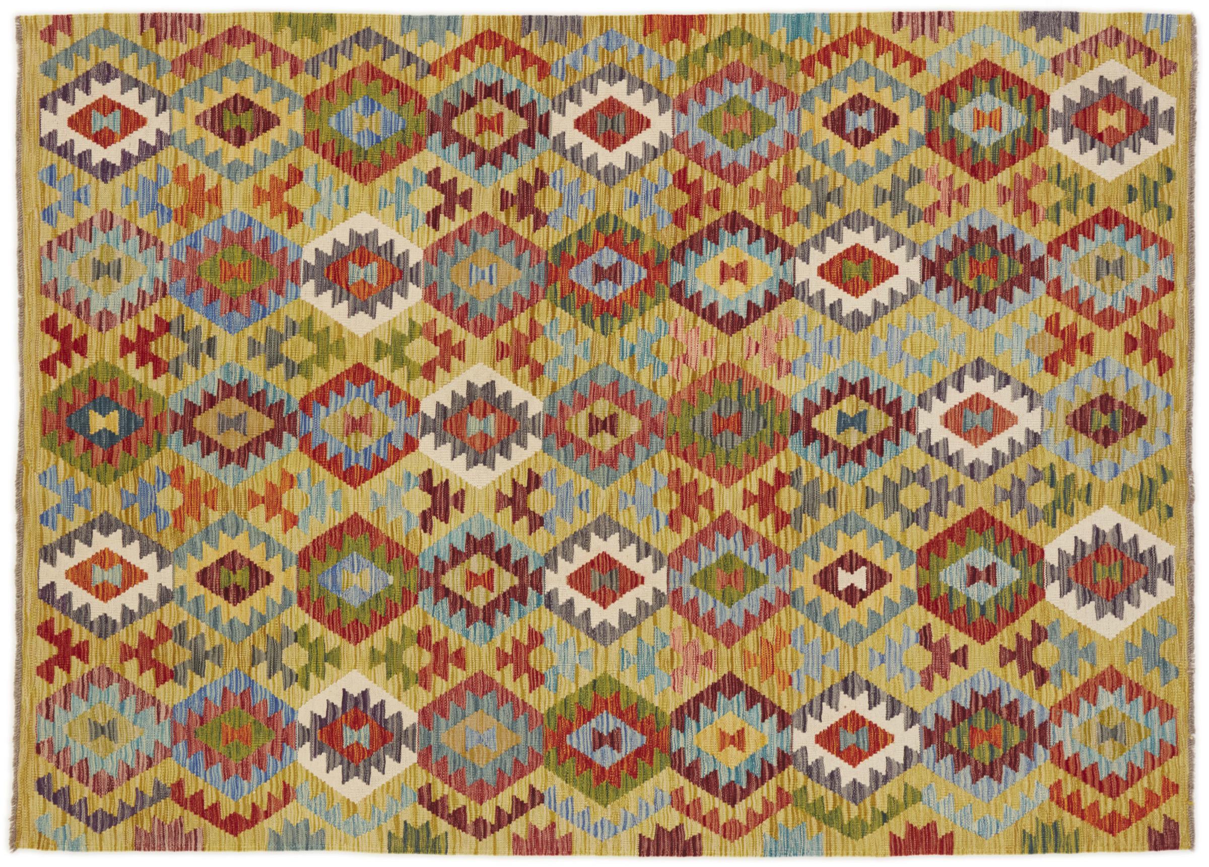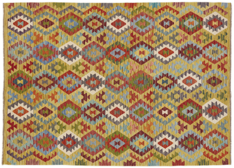 These Kilim rugs have a significant difference from hand-knotted rugs—they are handwoven. As a result, they do not have a high pile of wool and are often flatter and rougher than knotted wool rugs. Their construction is less intricate, making them generally much more affordable. Additionally, Kilim rugs are much lighter and can be laid out on either side. Handwoven Kilims originally come from what was once Persia and are now also widely produced in Afghanistan. They typically feature simple, straight-line patterns, which are characteristic of their weaving technique.