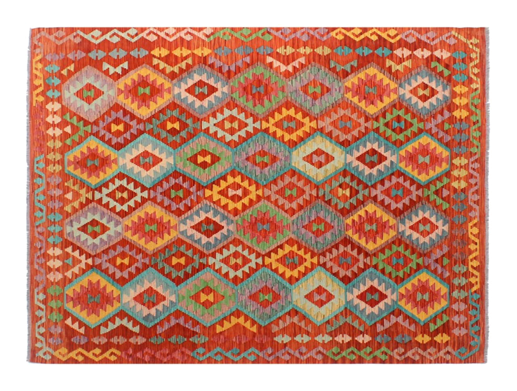 These Kilim rugs have a significant difference from hand-knotted rugs—they are handwoven. As a result, they do not have a high pile of wool and are often flatter and rougher than knotted wool rugs. Their construction is less intricate, making them generally much more affordable. Additionally, Kilim rugs are much lighter and can be laid out on either side. Handwoven Kilims originally come from what was once Persia and are now also widely produced in Afghanistan. They typically feature simple, straight-line patterns, which are characteristic of their weaving technique.
