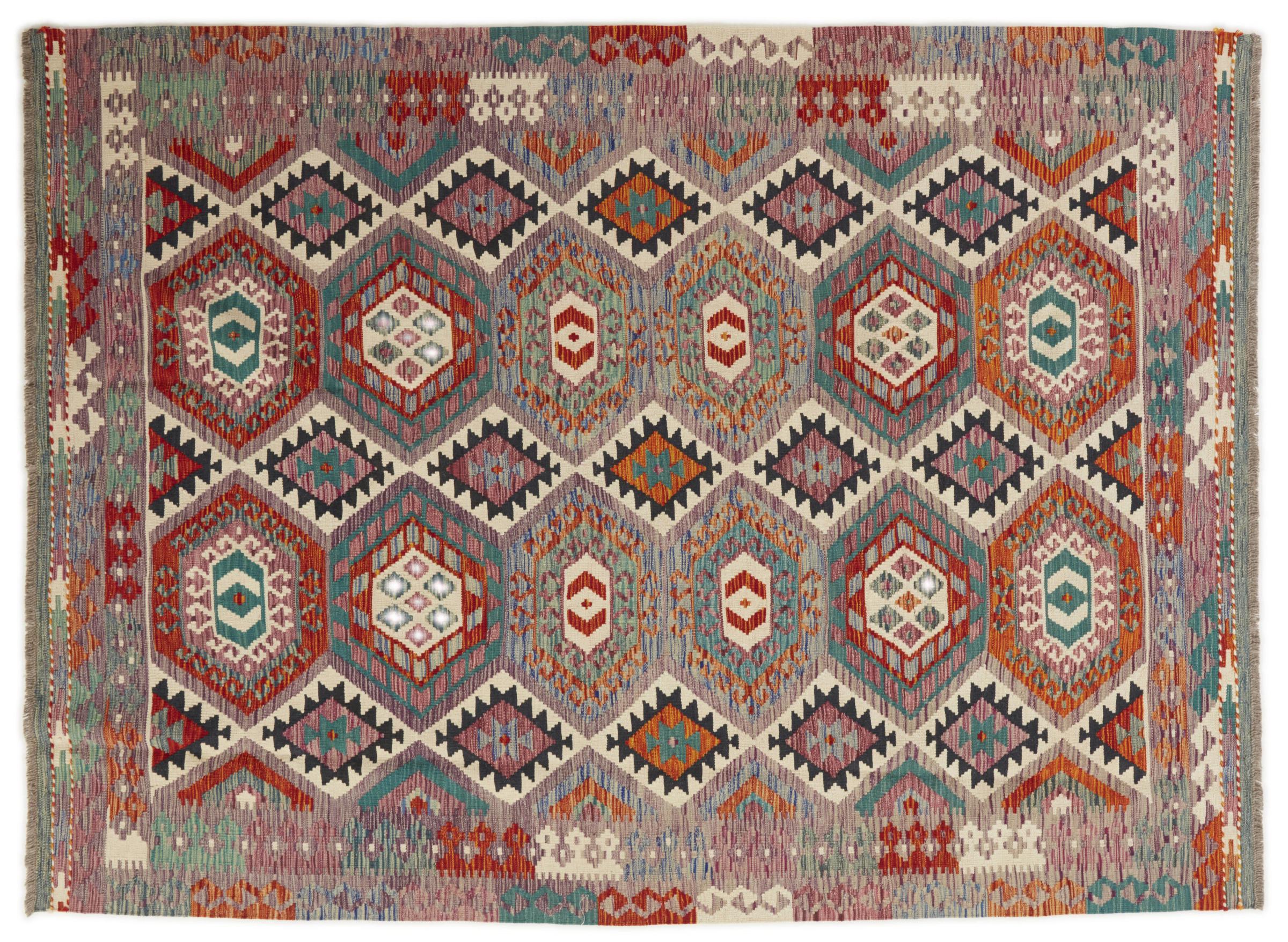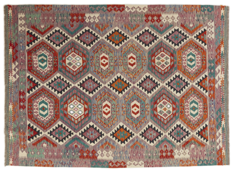 These Kilim rugs have a significant difference from hand-knotted rugs—they are handwoven. As a result, they do not have a high pile of wool and are often flatter and rougher than knotted wool rugs. Their construction is less intricate, making them generally much more affordable. Additionally, Kilim rugs are much lighter and can be laid out on either side. Handwoven Kilims originally come from what was once Persia and are now also widely produced in Afghanistan. They typically feature simple, straight-line patterns, which are characteristic of their weaving technique.
