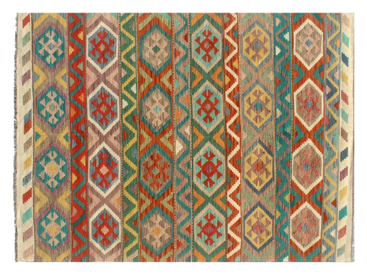 These Kilim rugs have a significant difference from hand-knotted rugs—they are handwoven. As a result, they do not have a high pile of wool and are often flatter and rougher than knotted wool rugs. Their construction is less intricate, making them generally much more affordable. Additionally, Kilim rugs are much lighter and can be laid out on either side. Handwoven Kilims originally come from what was once Persia and are now also widely produced in Afghanistan. They typically feature simple, straight-line patterns, which are characteristic of their weaving technique.