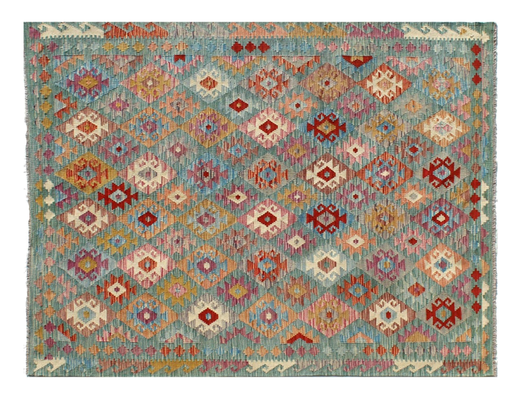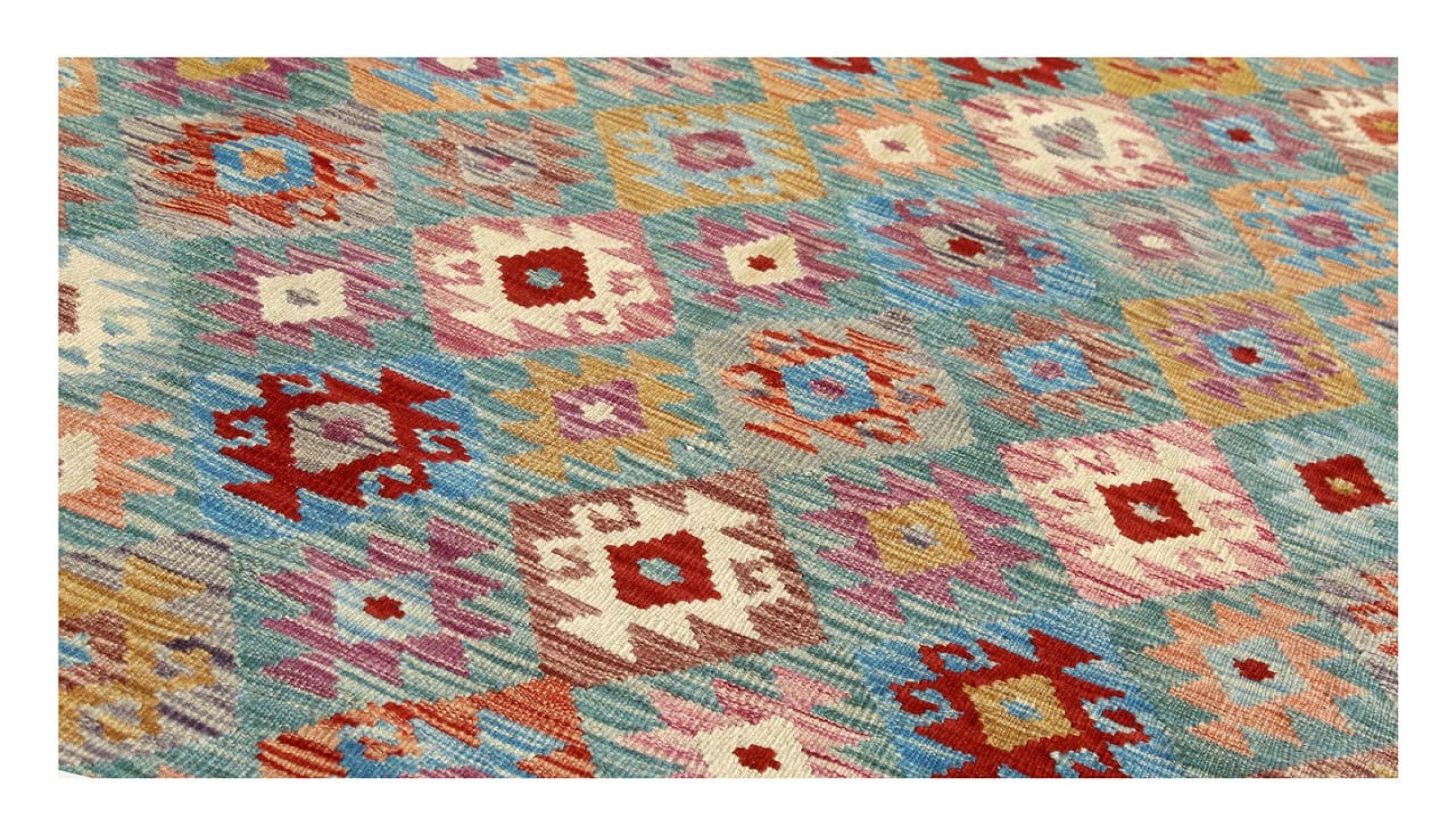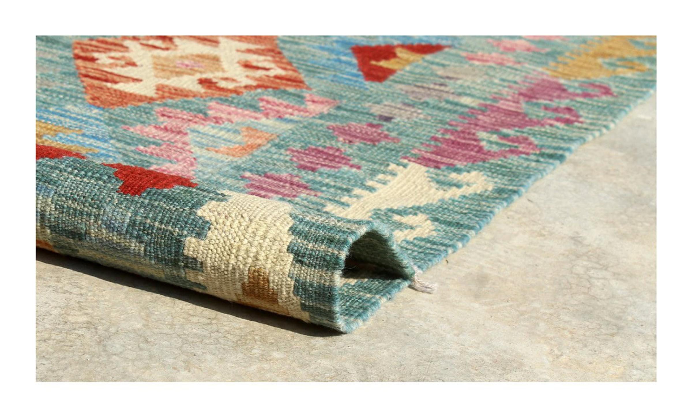 These Kilim rugs have a significant difference from hand-knotted rugs—they are handwoven. As a result, they do not have a high pile of wool and are often flatter and rougher than knotted wool rugs. Their construction is less intricate, making them generally much more affordable. Additionally, Kilim rugs are much lighter and can be laid out on either side. Handwoven Kilims originally come from what was once Persia and are now also widely produced in Afghanistan. They typically feature simple, straight-line patterns, which are characteristic of their weaving technique.