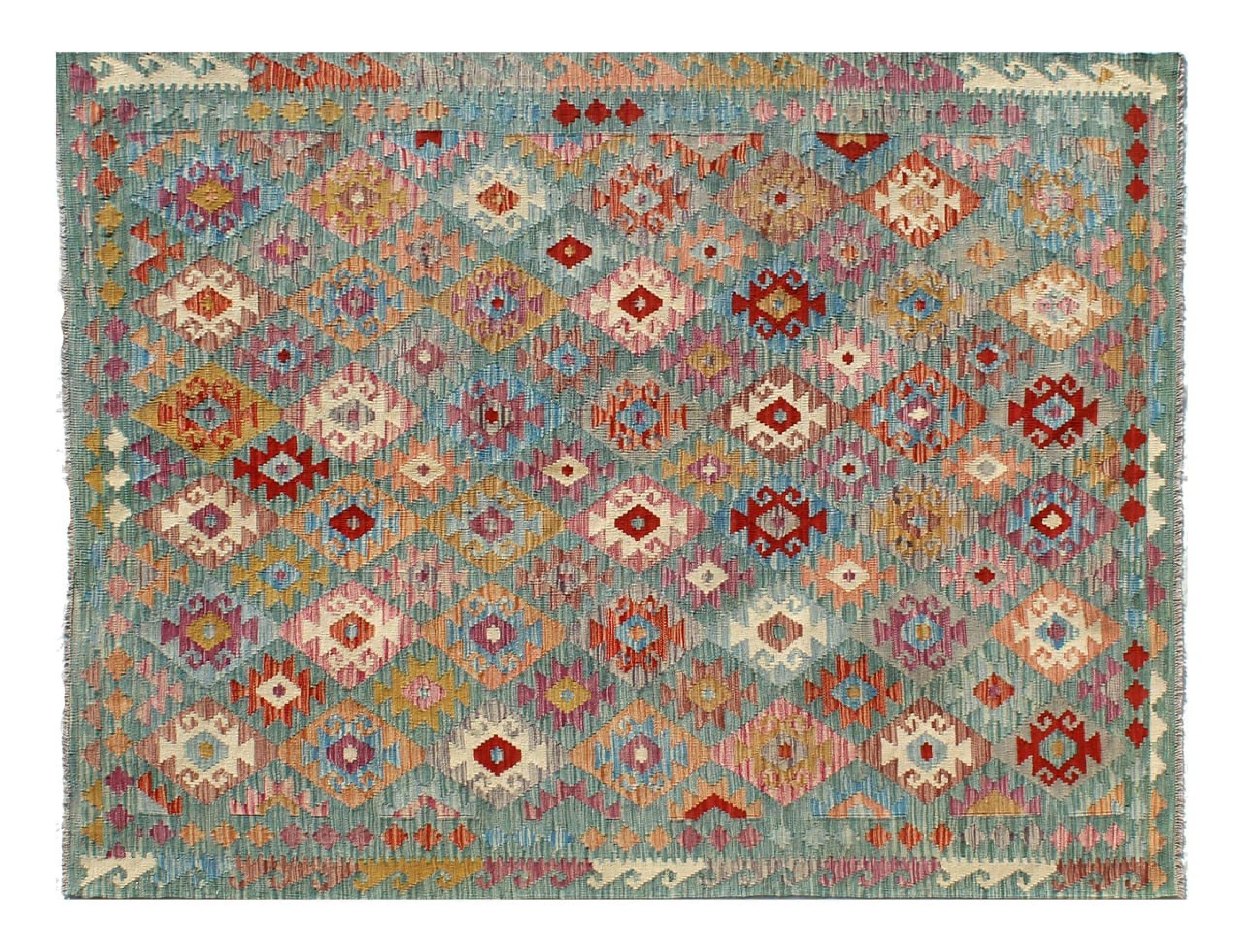 This Kilim Afghan rug has beautiful colors. It is handmade from fine wool. These patterns are traditional design elements that have already been used centuries ago. This particular kilim has been woven by hand in Afghanistan, a country with a long history in weaving and knotting rugs. The rug is robust and can be laid out on both sides.