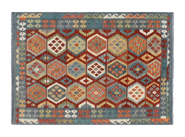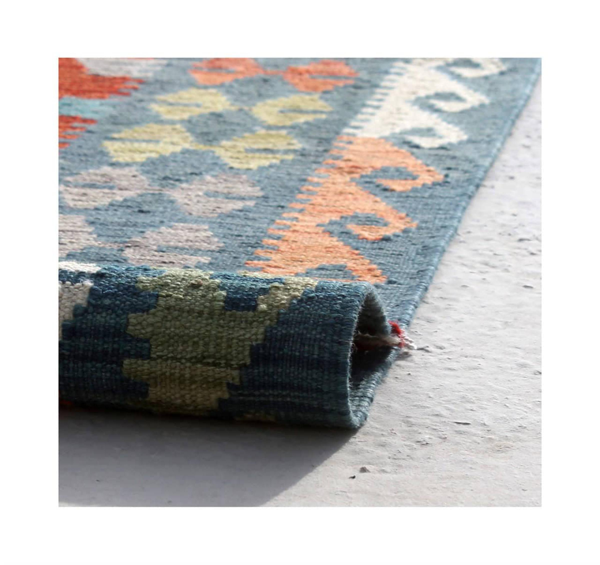 These Kilim rugs have a significant difference from hand-knotted rugs—they are handwoven. As a result, they do not have a high pile of wool and are often flatter and rougher than knotted wool rugs. Their construction is less intricate, making them generally much more affordable. Additionally, Kilim rugs are much lighter and can be laid out on either side. Handwoven Kilims originally come from what was once Persia and are now also widely produced in Afghanistan. They typically feature simple, straight-line patterns, which are characteristic of their weaving technique.