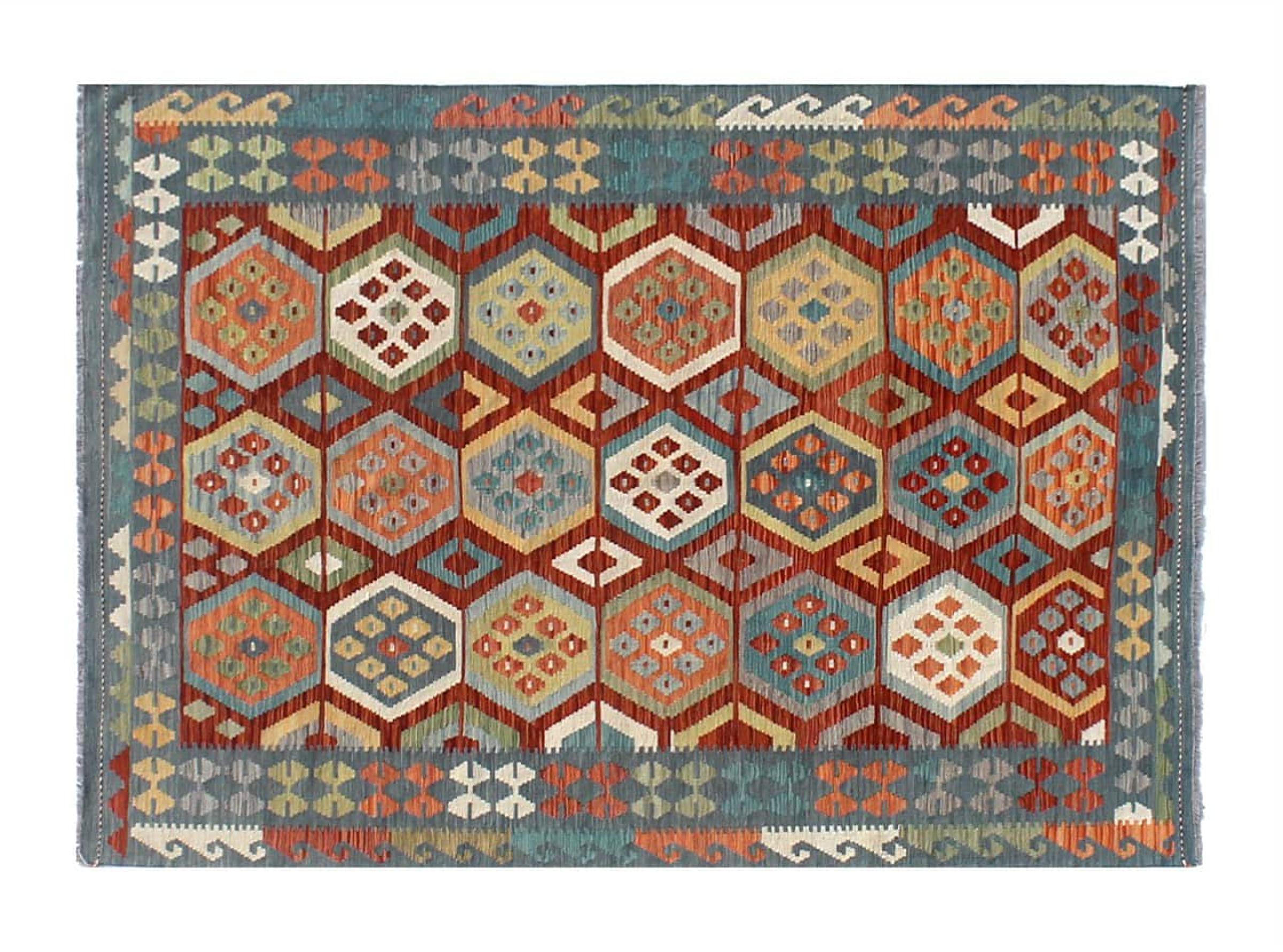 This Kilim Afghan rug has beautiful colors. It is handmade from fine wool. These patterns are traditional design elements that have already been used centuries ago. This particular kilim has been woven by hand in Afghanistan, a country with a long history in weaving and knotting rugs. The rug is robust and can be laid out on both sides.