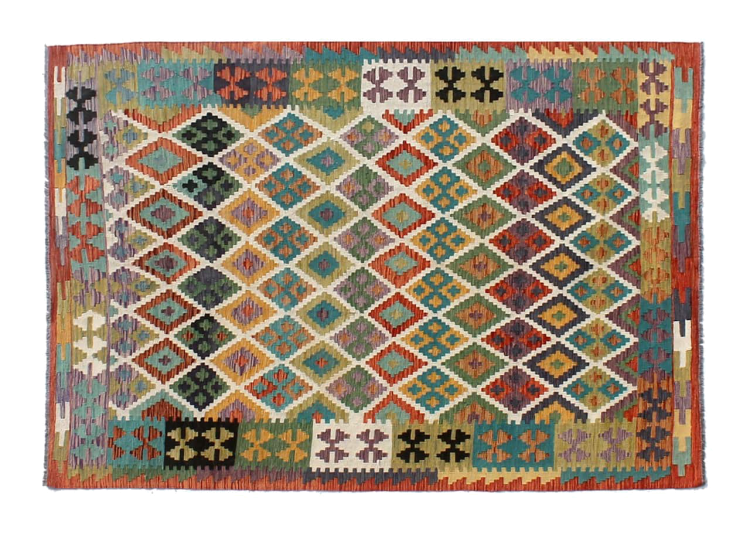 This Kilim Afghan rug has beautiful colors. It is handmade from fine wool. These patterns are traditional design elements that have already been used centuries ago. This particular kilim has been woven by hand in Afghanistan, a country with a long history in weaving and knotting rugs. The rug is robust and can be laid out on both sides.
