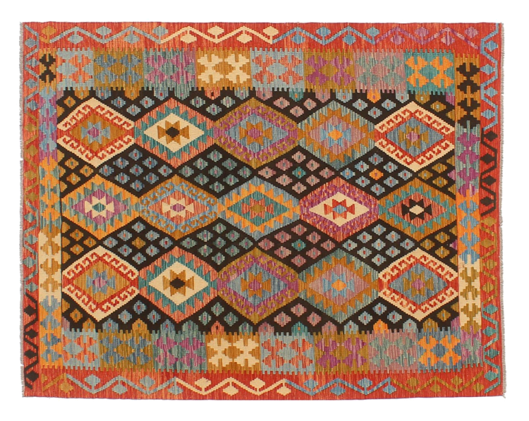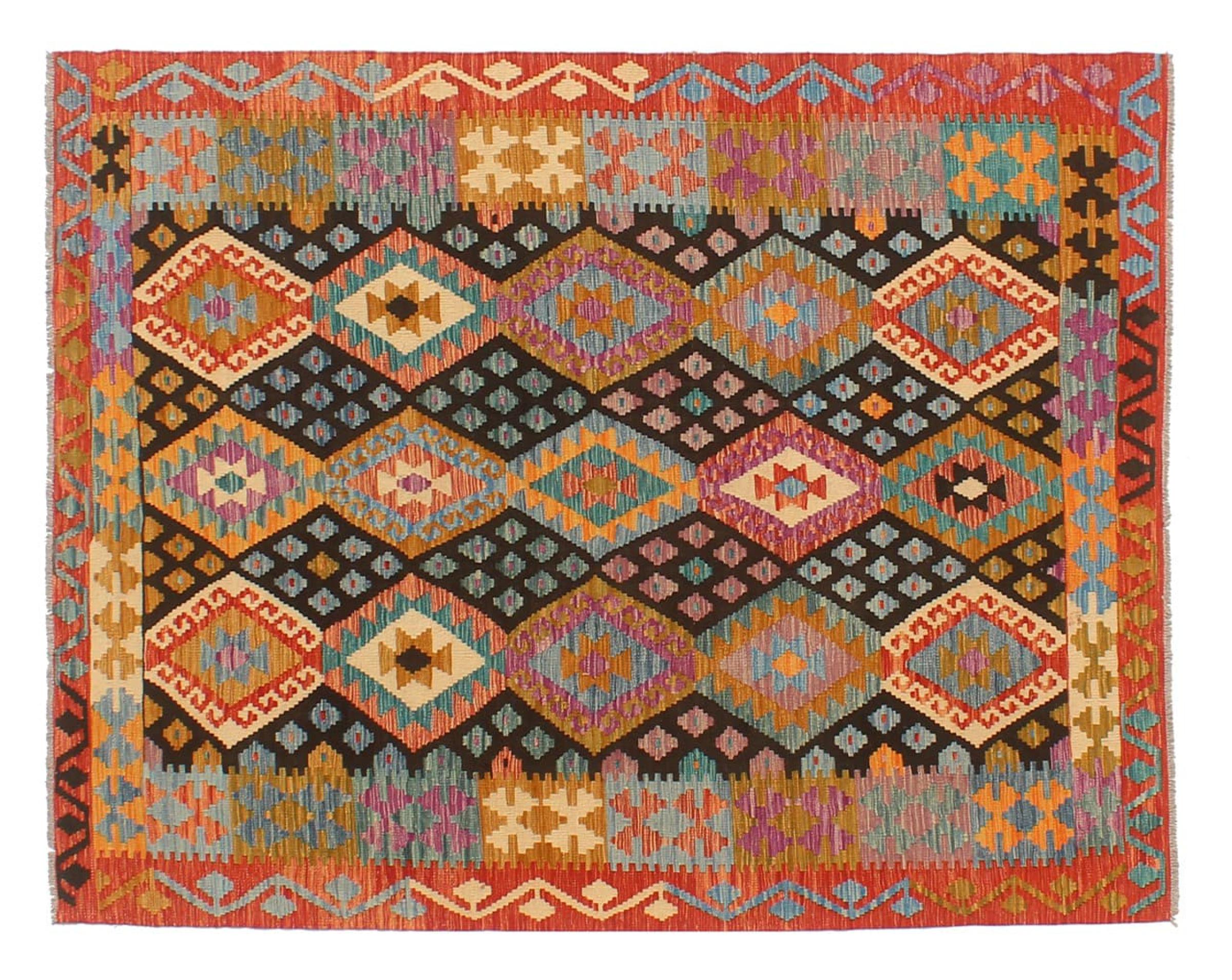 This Kilim Afghan rug has beautiful colors. It is handmade from fine wool. These patterns are traditional design elements that have already been used centuries ago. This particular kilim has been woven by hand in Afghanistan, a country with a long history in weaving and knotting rugs. The rug is robust and can be laid out on both sides.