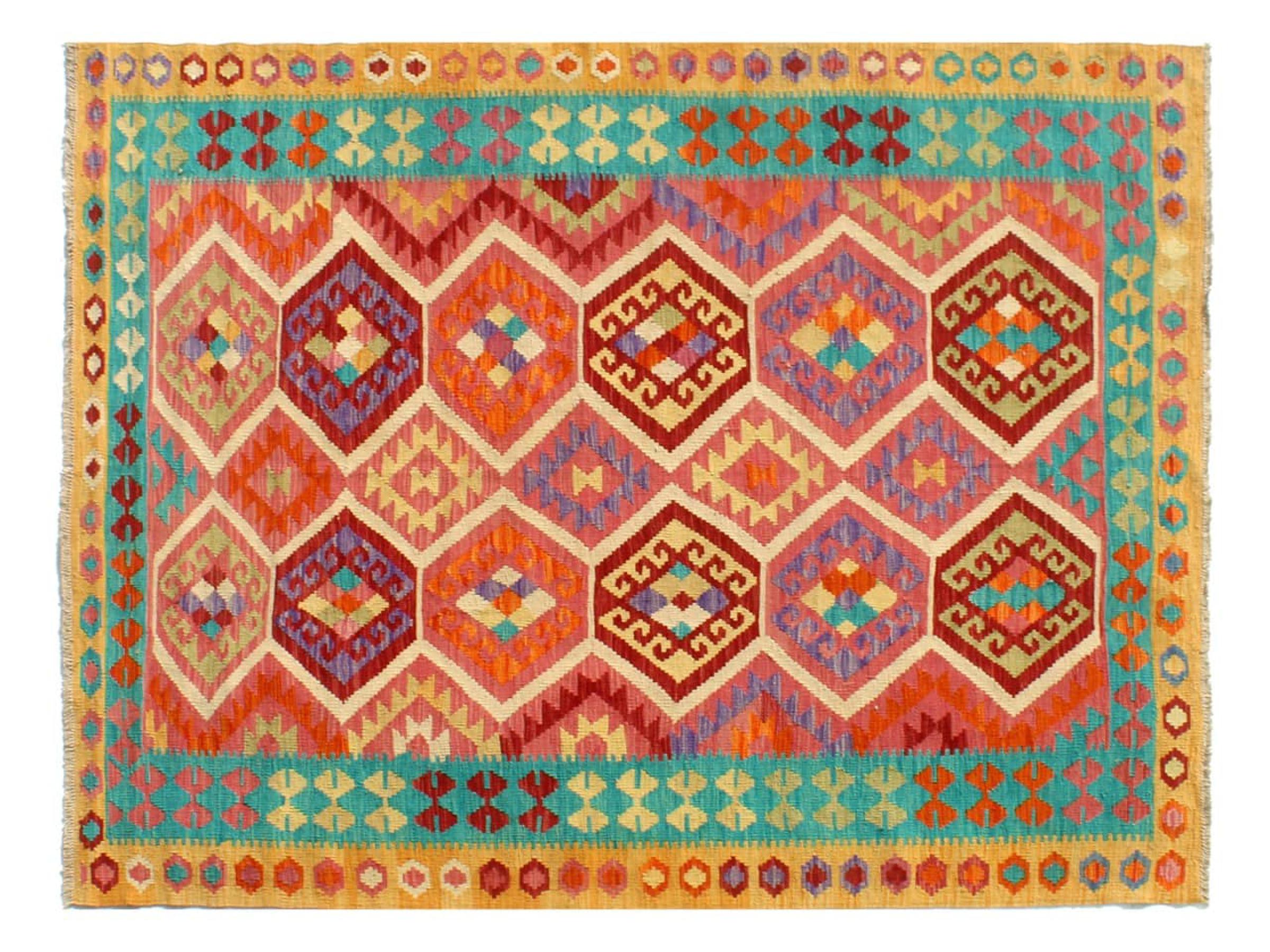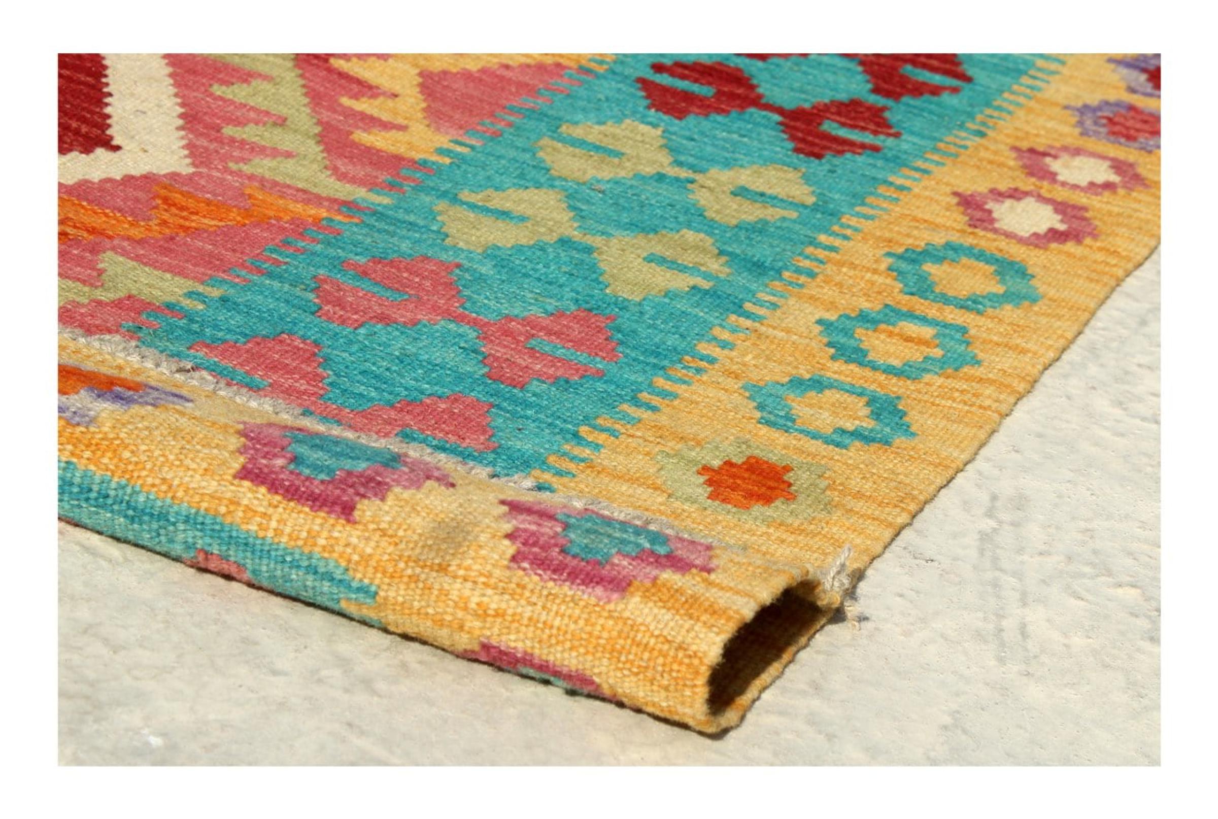 This Kilim Afghan rug has beautiful colors. It is handmade from fine wool. These patterns are traditional design elements that have already been used centuries ago. This particular kilim has been woven by hand in Afghanistan, a country with a long history in weaving and knotting rugs. The rug is robust and can be laid out on both sides.
