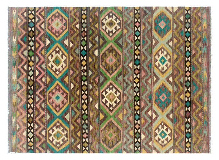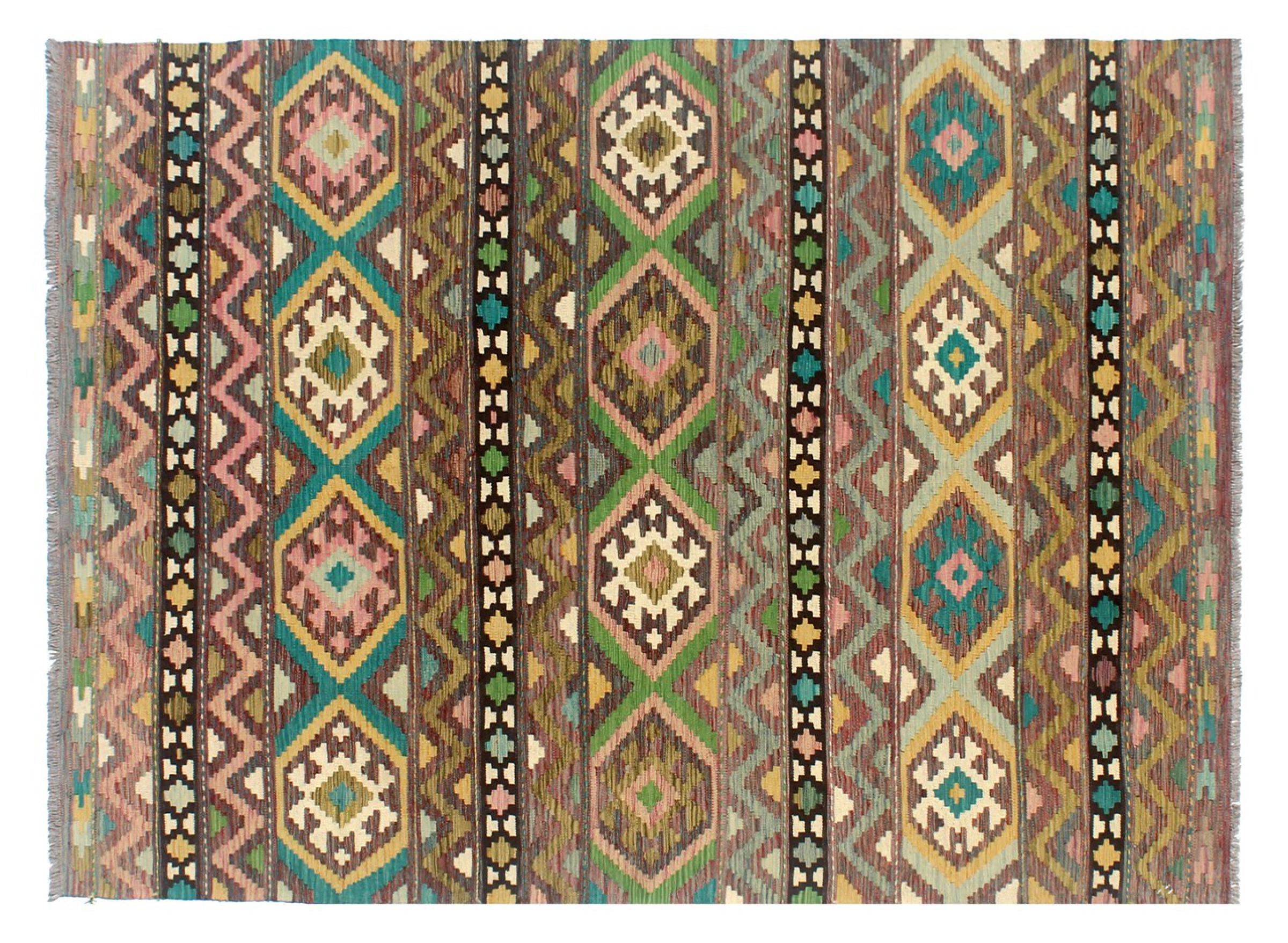 These Kilim rugs have a significant difference from hand-knotted rugs—they are handwoven. As a result, they do not have a high pile of wool and are often flatter and rougher than knotted wool rugs. Their construction is less intricate, making them generally much more affordable. Additionally, Kilim rugs are much lighter and can be laid out on either side. Handwoven Kilims originally come from what was once Persia and are now also widely produced in Afghanistan. They typically feature simple, straight-line patterns, which are characteristic of their weaving technique.