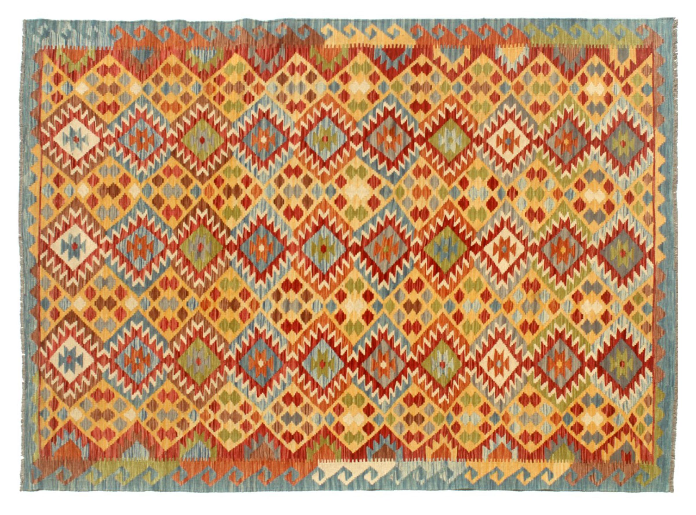 This Kilim Afghan rug has beautiful colors. It is handmade from fine wool. These patterns are traditional design elements that have already been used centuries ago. This particular kilim has been woven by hand in Afghanistan, a country with a long history in weaving and knotting rugs. The rug is robust and can be laid out on both sides.