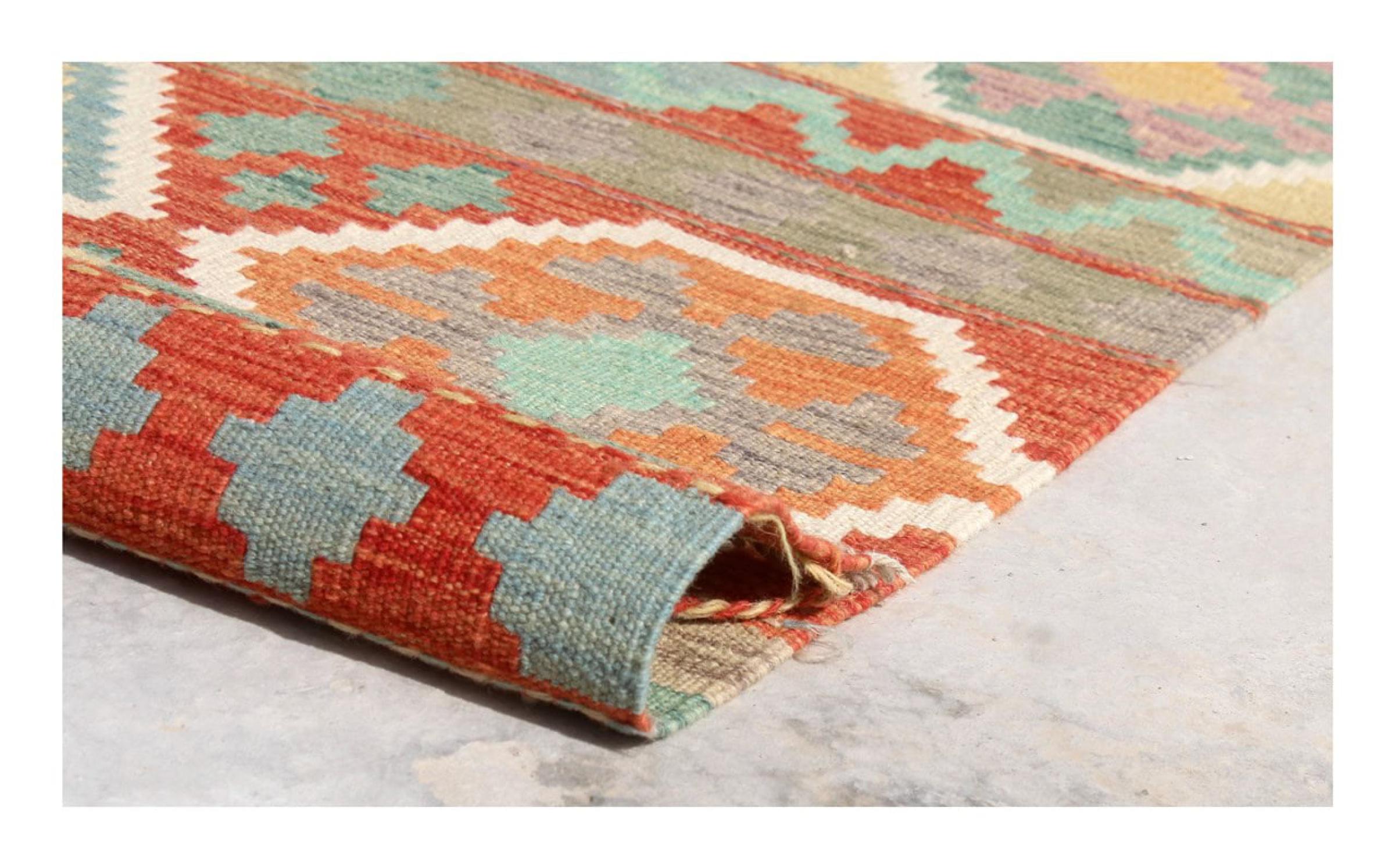 These Kilim rugs have a significant difference from hand-knotted rugs—they are handwoven. As a result, they do not have a high pile of wool and are often flatter and rougher than knotted wool rugs. Their construction is less intricate, making them generally much more affordable. Additionally, Kilim rugs are much lighter and can be laid out on either side. Handwoven Kilims originally come from what was once Persia and are now also widely produced in Afghanistan. They typically feature simple, straight-line patterns, which are characteristic of their weaving technique.