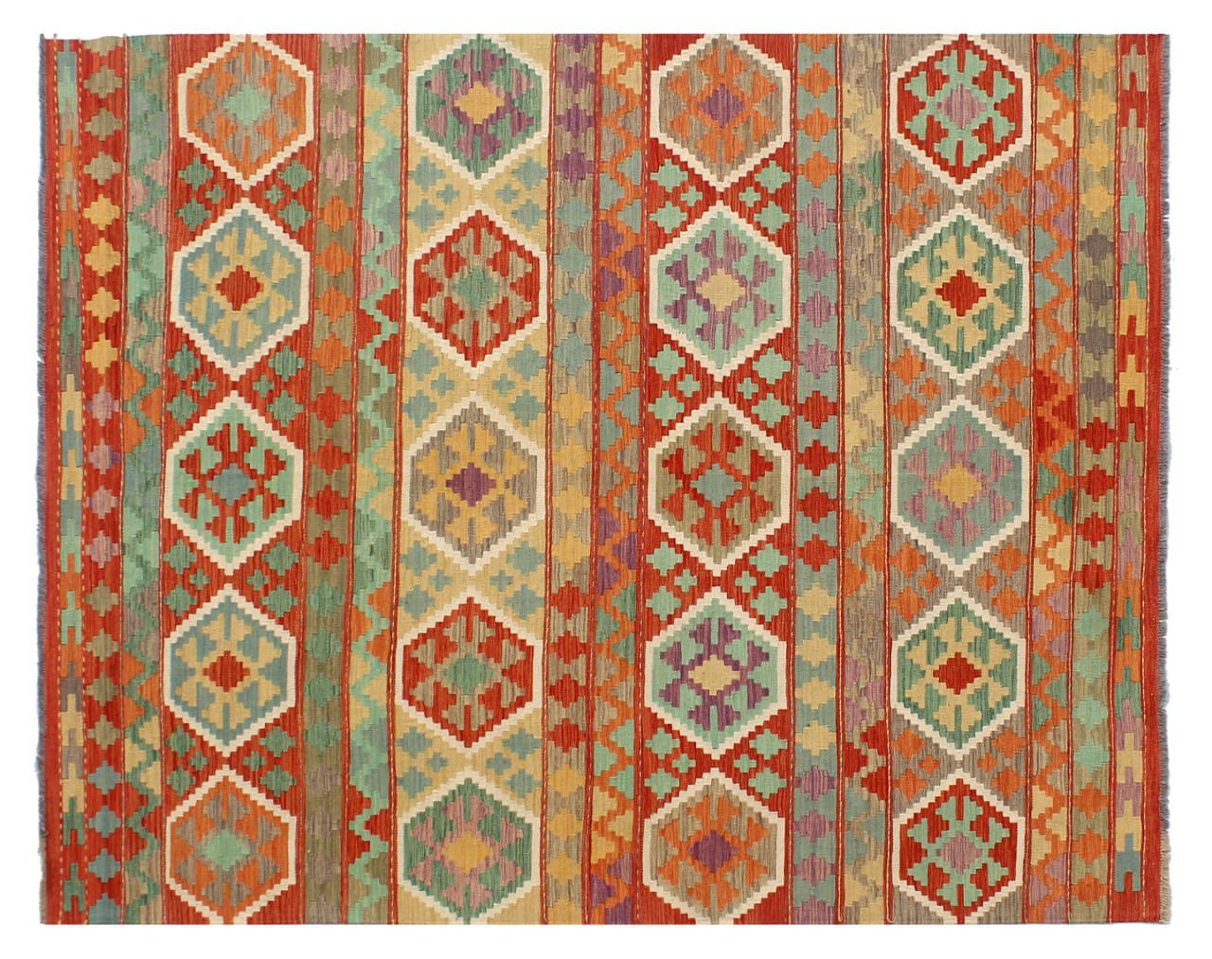 This Kilim Afghan rug has beautiful colors. It is handmade from fine wool. These patterns are traditional design elements that have already been used centuries ago. This particular kilim has been woven by hand in Afghanistan, a country with a long history in weaving and knotting rugs. The rug is robust and can be laid out on both sides.