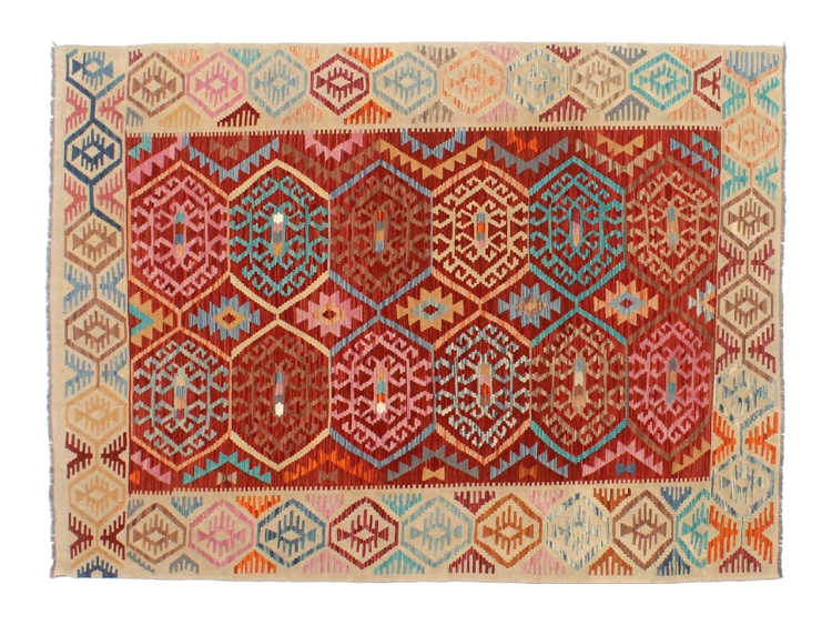 These Kilim rugs have a significant difference from hand-knotted rugs—they are handwoven. As a result, they do not have a high pile of wool and are often flatter and rougher than knotted wool rugs. Their construction is less intricate, making them generally much more affordable. Additionally, Kilim rugs are much lighter and can be laid out on either side. Handwoven Kilims originally come from what was once Persia and are now also widely produced in Afghanistan. They typically feature simple, straight-line patterns, which are characteristic of their weaving technique.