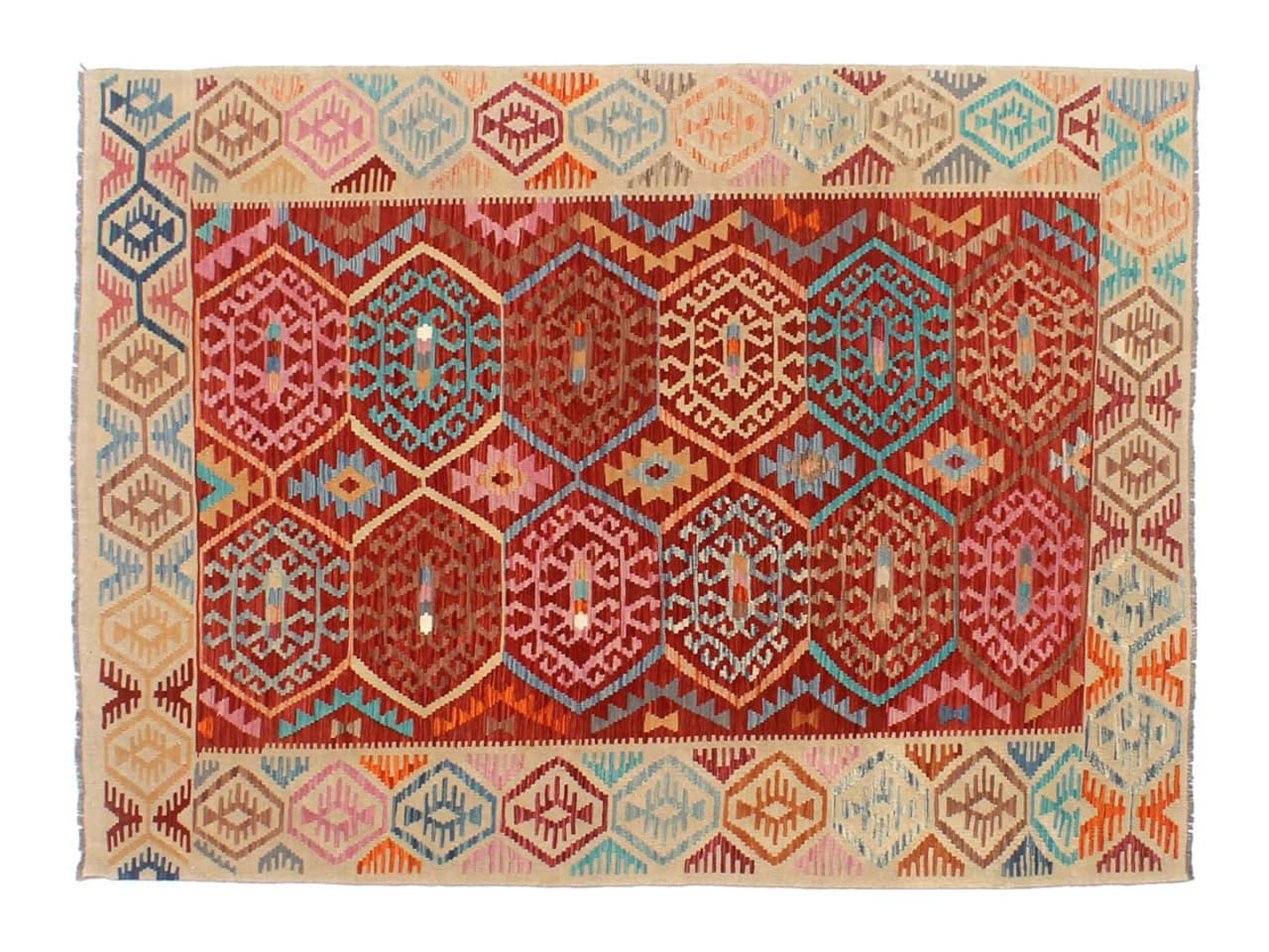 This Kilim Afghan rug has beautiful colors. It is handmade from fine wool. These patterns are traditional design elements that have already been used centuries ago. This particular kilim has been woven by hand in Afghanistan, a country with a long history in weaving and knotting rugs. The rug is robust and can be laid out on both sides.