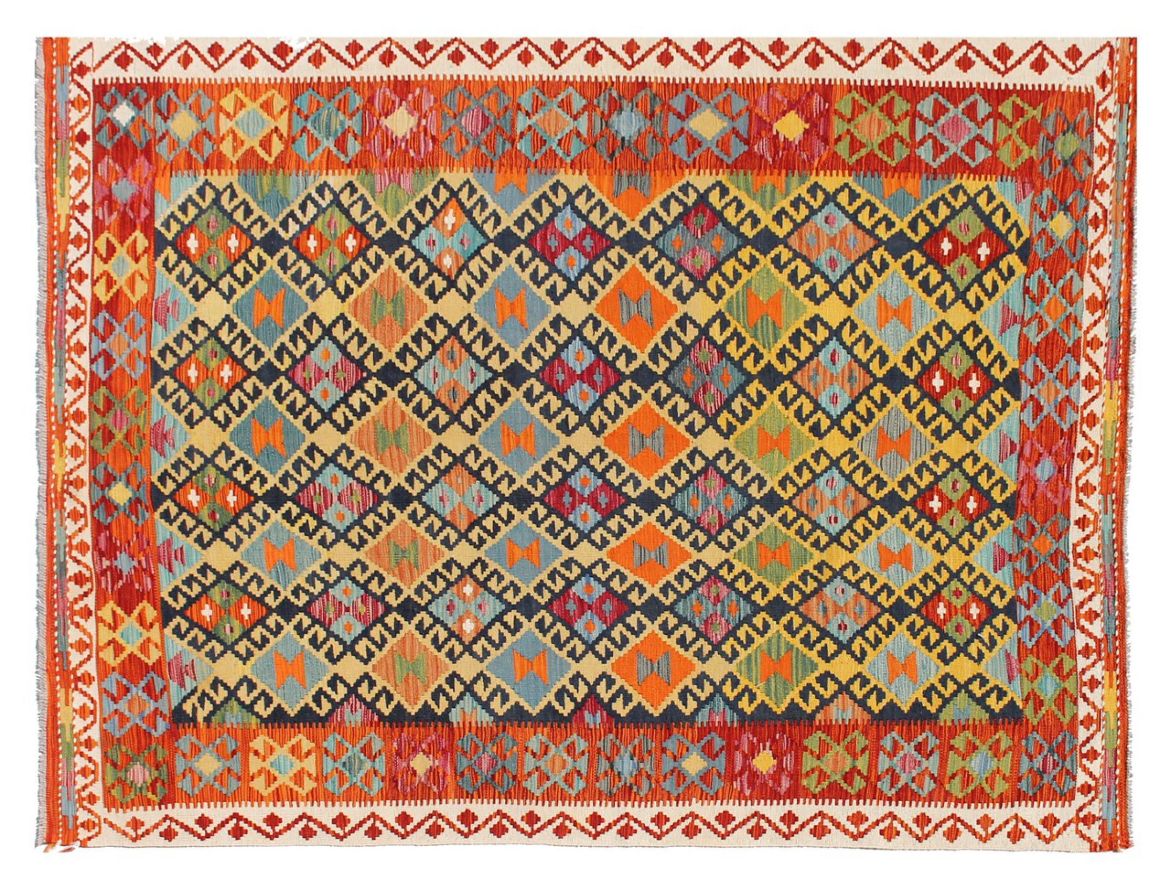 This Kilim Afghan rug has beautiful colors. It is handmade from fine wool. These patterns are traditional design elements that have already been used centuries ago. This particular kilim has been woven by hand in Afghanistan, a country with a long history in weaving and knotting rugs. The rug is robust and can be laid out on both sides.