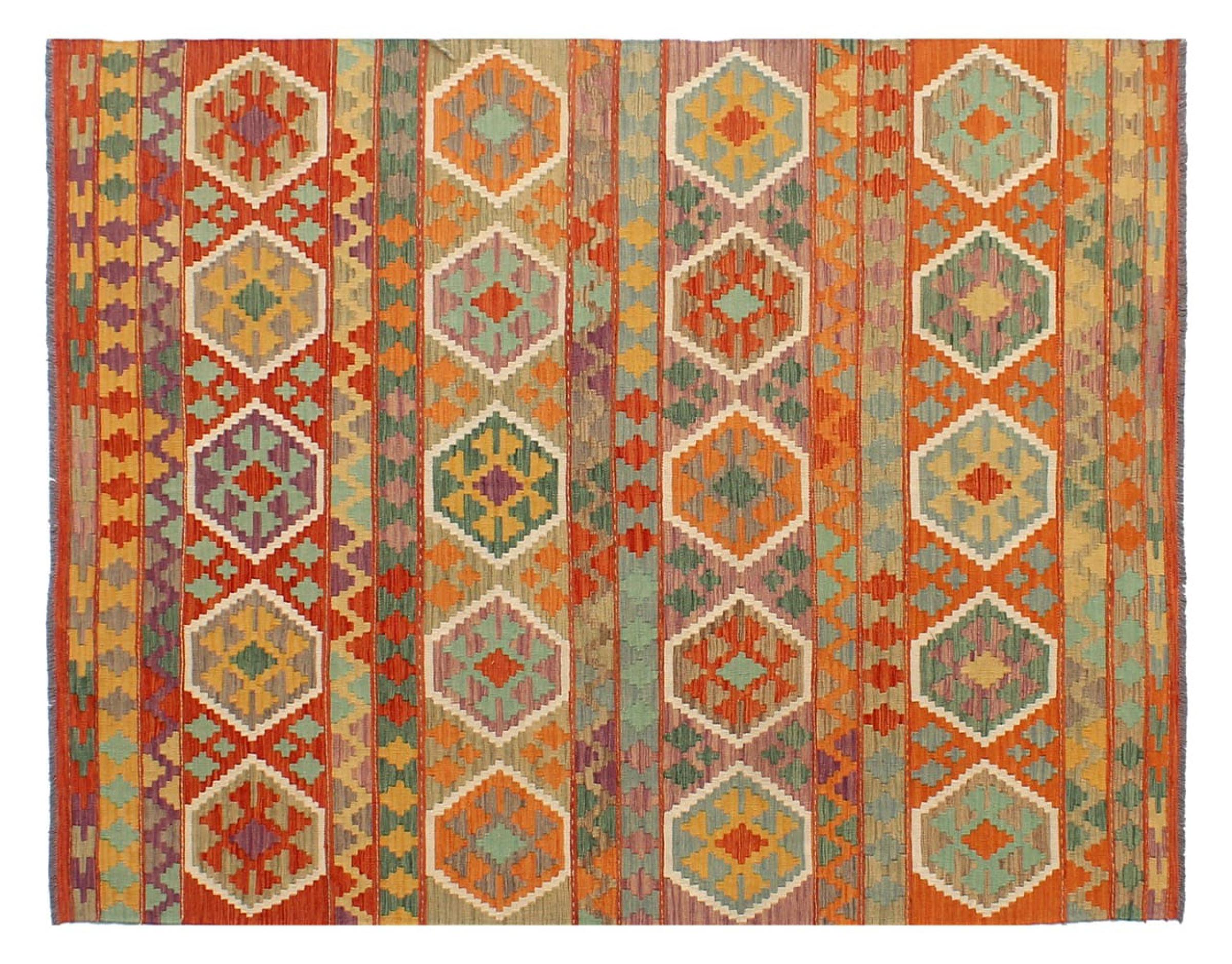 This Kilim Afghan rug has beautiful colors. It is handmade from fine wool. These patterns are traditional design elements that have already been used centuries ago. This particular kilim has been woven by hand in Afghanistan, a country with a long history in weaving and knotting rugs. The rug is robust and can be laid out on both sides.