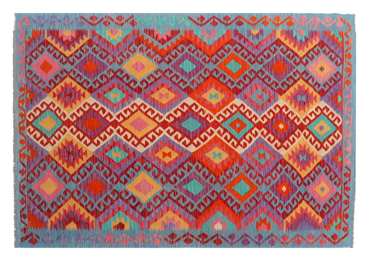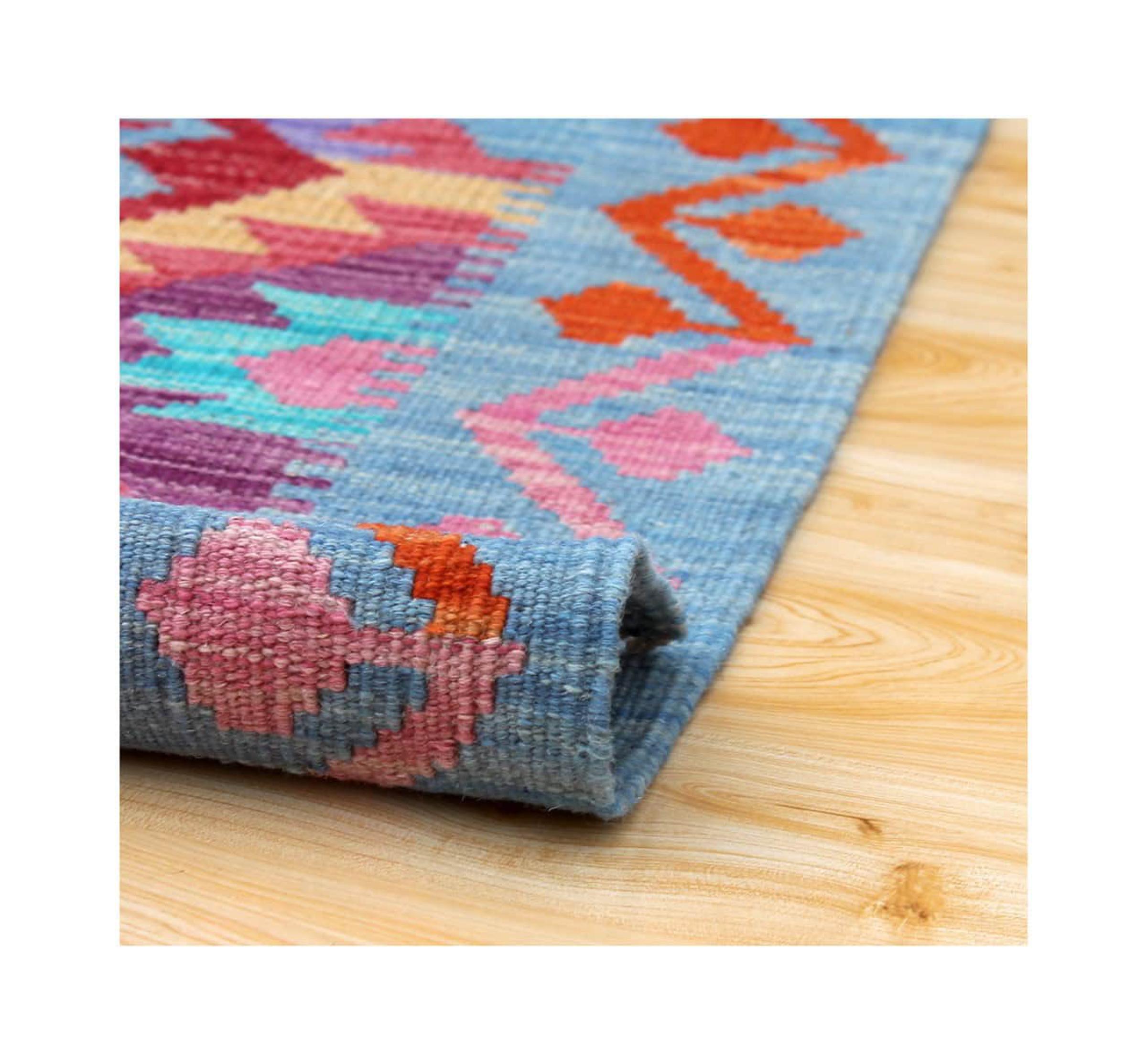 These Kilim rugs have a significant difference from hand-knotted rugs—they are handwoven. As a result, they do not have a high pile of wool and are often flatter and rougher than knotted wool rugs. Their construction is less intricate, making them generally much more affordable. Additionally, Kilim rugs are much lighter and can be laid out on either side. Handwoven Kilims originally come from what was once Persia and are now also widely produced in Afghanistan. They typically feature simple, straight-line patterns, which are characteristic of their weaving technique.