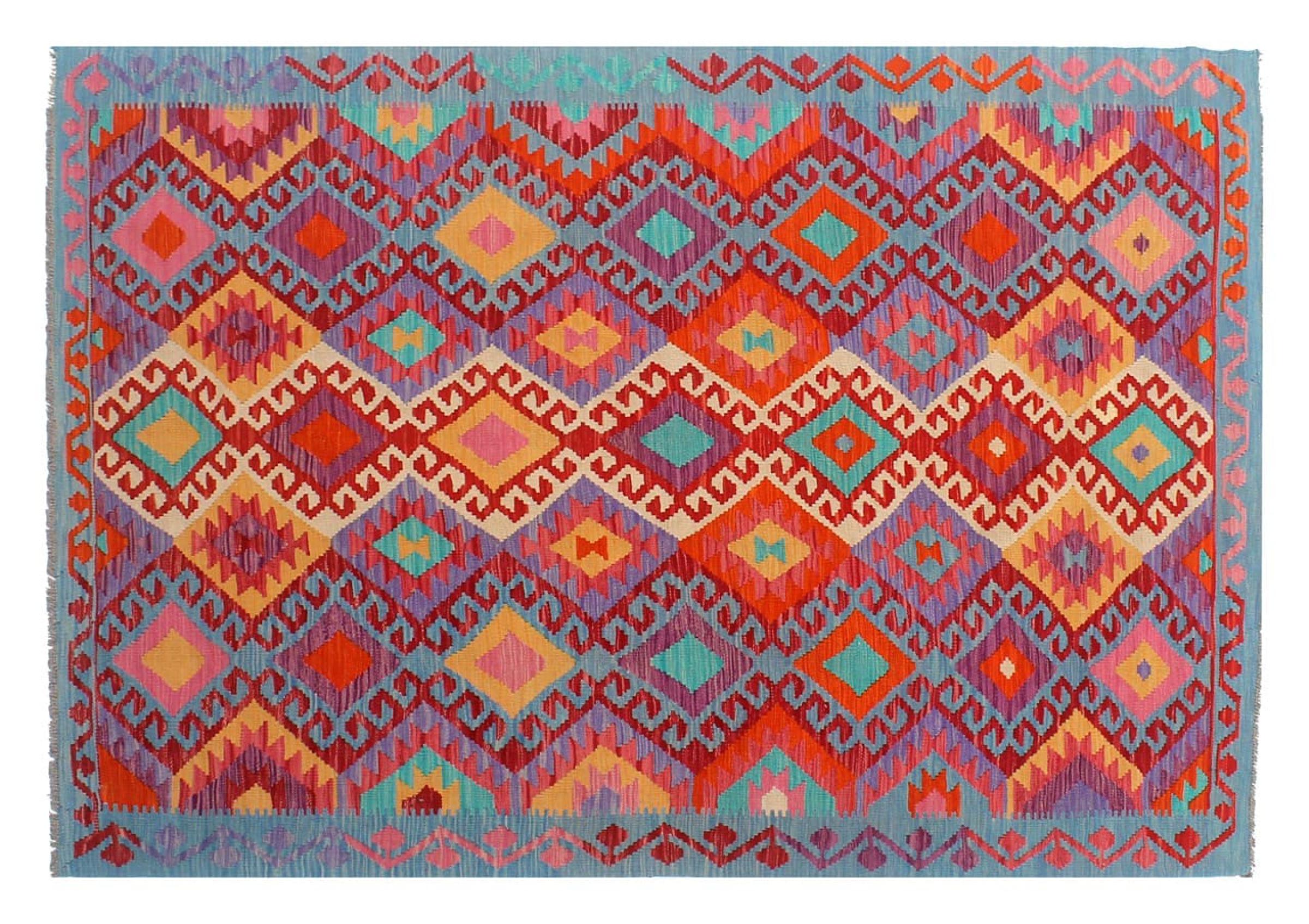 This Kilim Afghan rug has beautiful colors. It is handmade from fine wool. These patterns are traditional design elements that have already been used centuries ago. This particular kilim has been woven by hand in Afghanistan, a country with a long history in weaving and knotting rugs. The rug is robust and can be laid out on both sides.