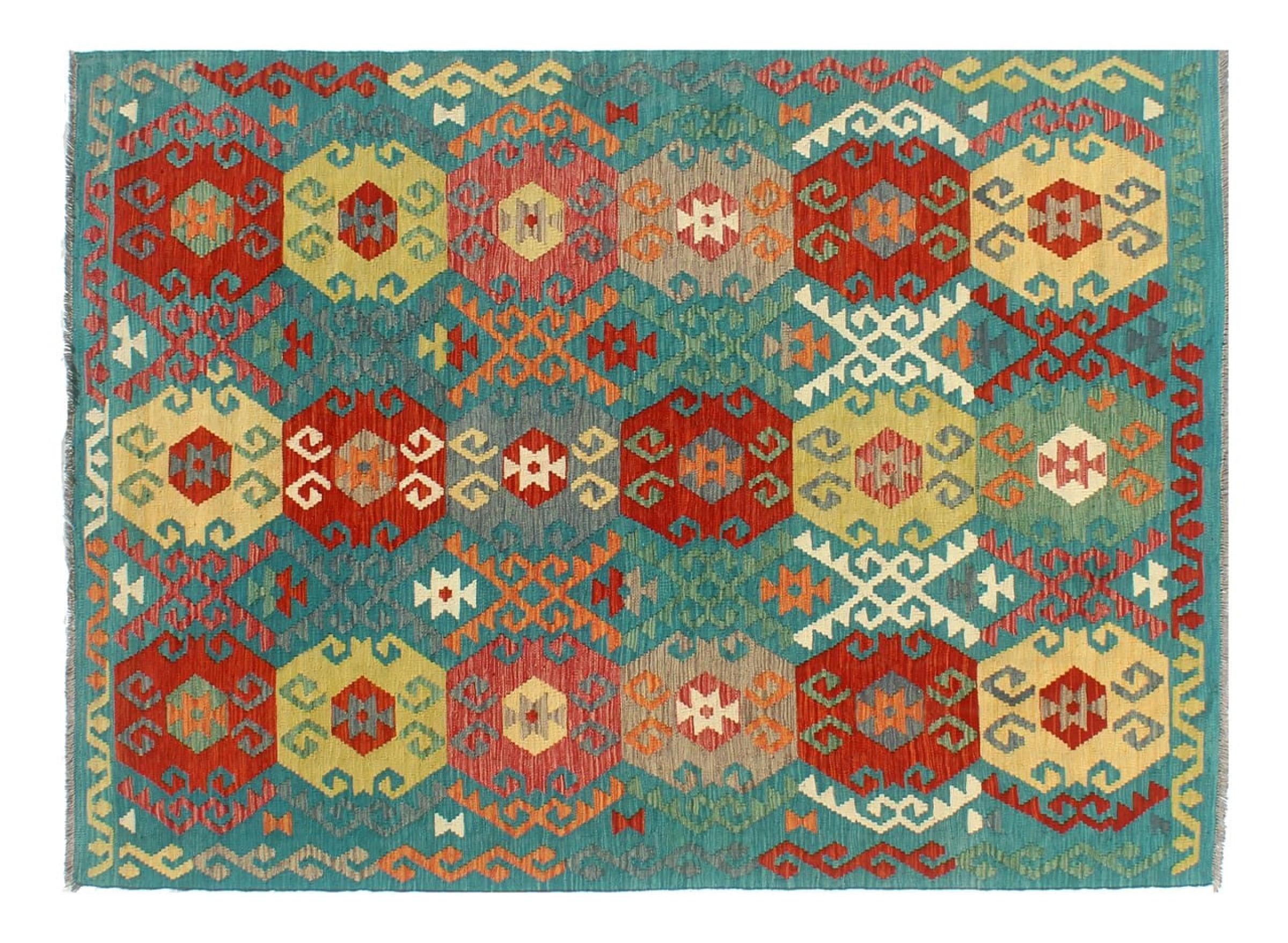 These Kilim rugs have a significant difference from hand-knotted rugs—they are handwoven. As a result, they do not have a high pile of wool and are often flatter and rougher than knotted wool rugs. Their construction is less intricate, making them generally much more affordable. Additionally, Kilim rugs are much lighter and can be laid out on either side. Handwoven Kilims originally come from what was once Persia and are now also widely produced in Afghanistan. They typically feature simple, straight-line patterns, which are characteristic of their weaving technique.