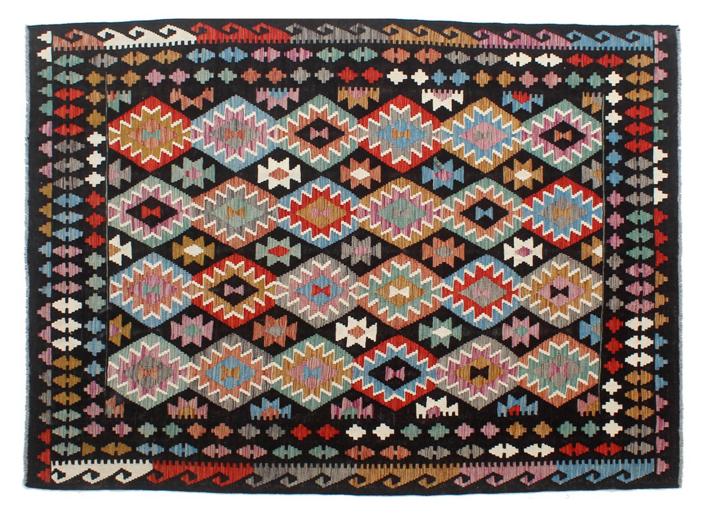 These Kilim rugs have a significant difference from hand-knotted rugs—they are handwoven. As a result, they do not have a high pile of wool and are often flatter and rougher than knotted wool rugs. Their construction is less intricate, making them generally much more affordable. Additionally, Kilim rugs are much lighter and can be laid out on either side. Handwoven Kilims originally come from what was once Persia and are now also widely produced in Afghanistan. They typically feature simple, straight-line patterns, which are characteristic of their weaving technique.