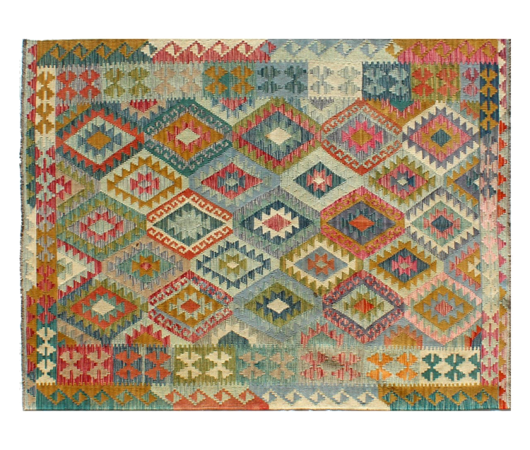 These Kilim rugs have a significant difference from hand-knotted rugs—they are handwoven. As a result, they do not have a high pile of wool and are often flatter and rougher than knotted wool rugs. Their construction is less intricate, making them generally much more affordable. Additionally, Kilim rugs are much lighter and can be laid out on either side. Handwoven Kilims originally come from what was once Persia and are now also widely produced in Afghanistan. They typically feature simple, straight-line patterns, which are characteristic of their weaving technique.
