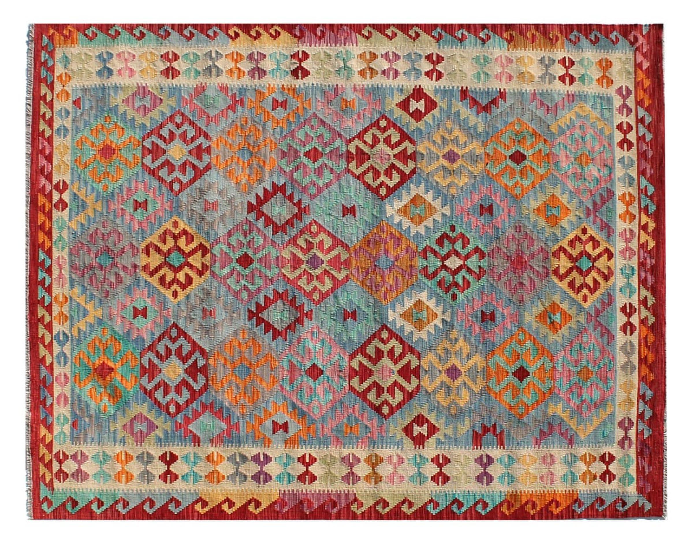 This Kilim Afghan rug has beautiful colors. It is handmade from fine wool. These patterns are traditional design elements that have already been used centuries ago. This particular kilim has been woven by hand in Afghanistan, a country with a long history in weaving and knotting rugs. The rug is robust and can be laid out on both sides.