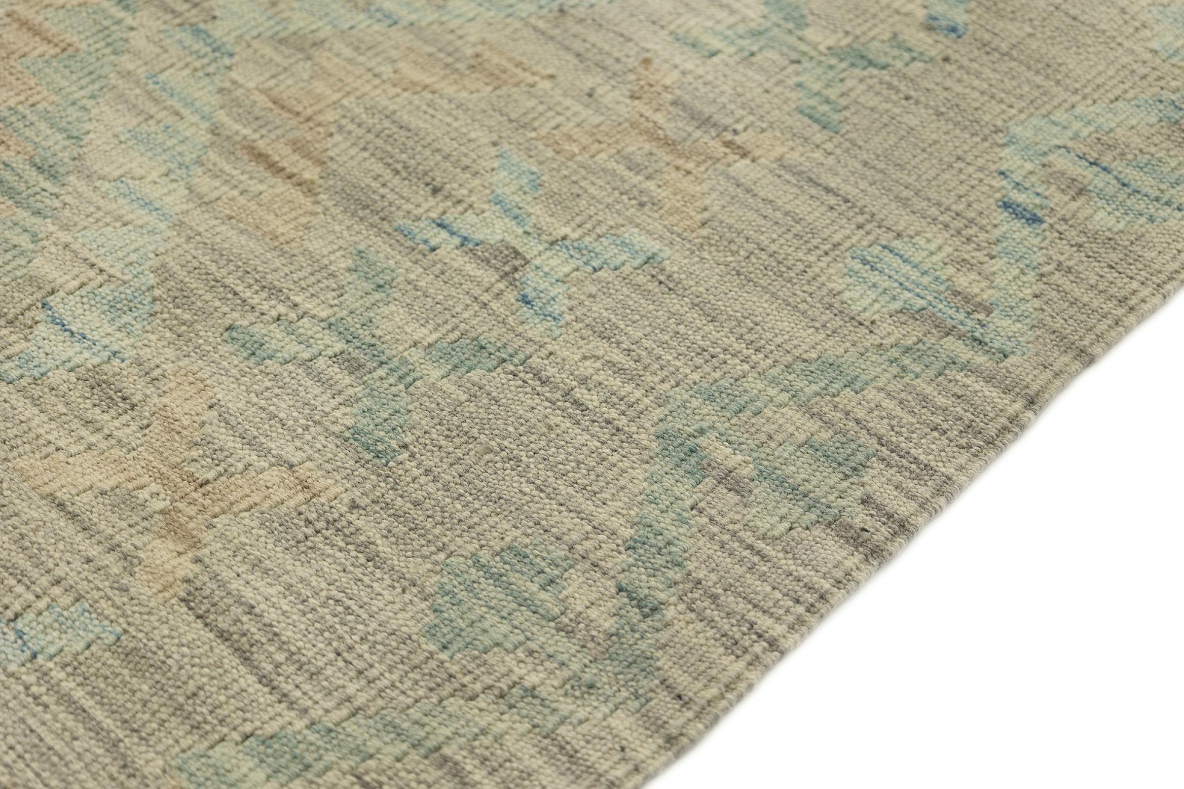 This rug was made as a flat weave by hand on a loom. Flatweave is the term used to describe rugs that have no pile. As the name promises, these rugs are woven and not knotted. This results in a flat rug with a structured surface. Flatweaves are not as soft and usually thinner than knotted rugs. At the same time they are much less complex to manufacture and can usually be laid out from both sides (front and back). Their patterns are usually geometric, which is determined by the fabric.