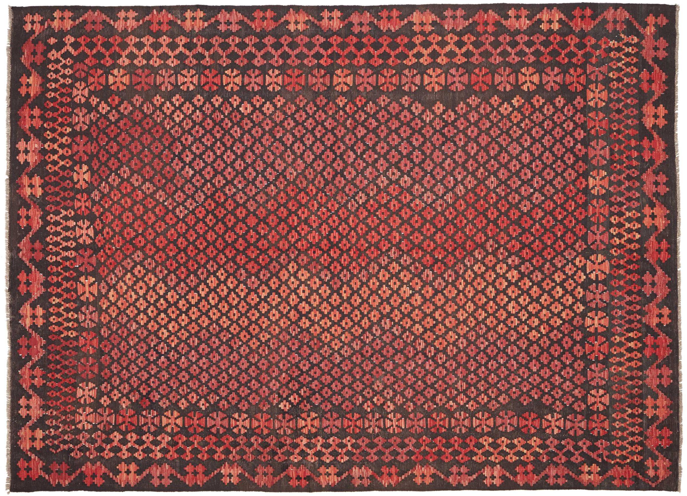 These Kilim rugs have a significant difference from hand-knotted rugs—they are handwoven. As a result, they do not have a high pile of wool and are often flatter and rougher than knotted wool rugs. Their construction is less intricate, making them generally much more affordable. Additionally, Kilim rugs are much lighter and can be laid out on either side. Handwoven Kilims originally come from what was once Persia and are now also widely produced in Afghanistan. They typically feature simple, straight-line patterns, which are characteristic of their weaving technique.