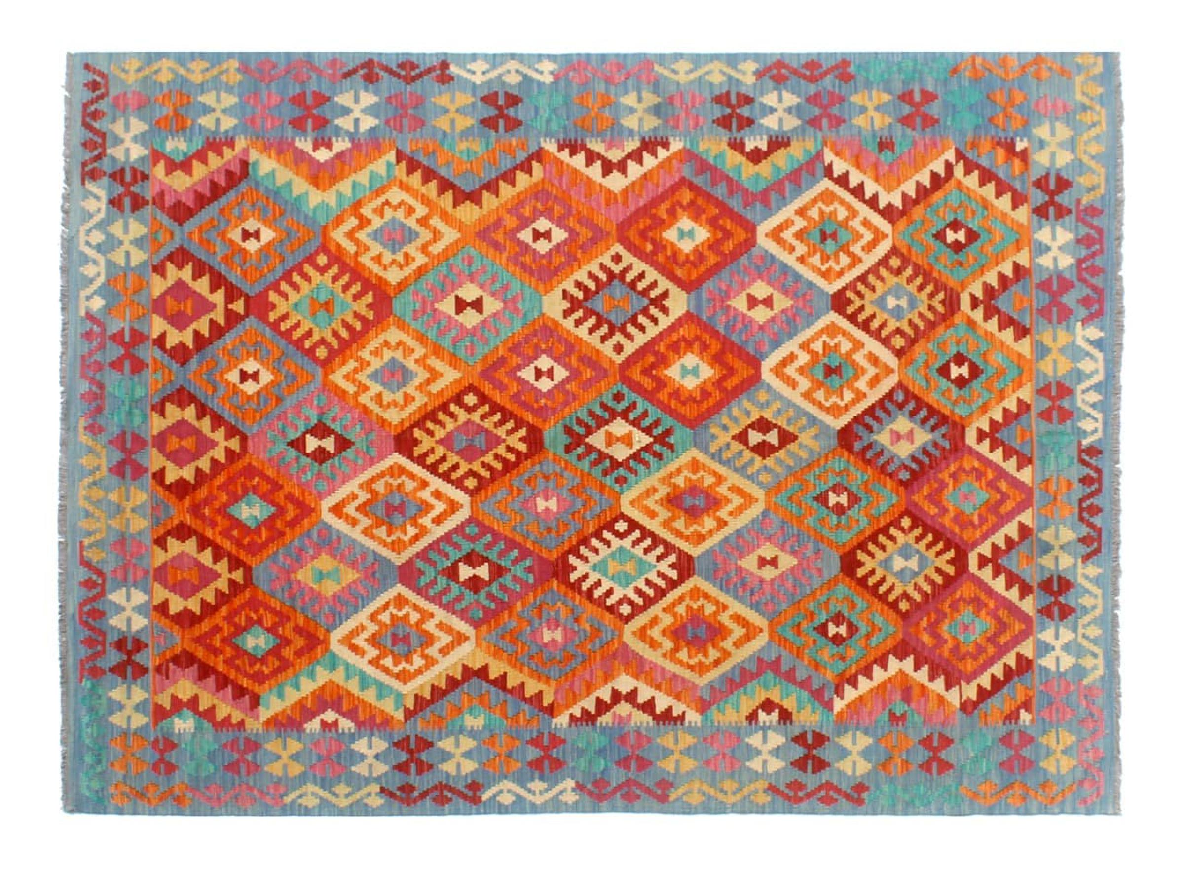 This Kilim Afghan rug has beautiful colors. It is handmade from fine wool. These patterns are traditional design elements that have already been used centuries ago. This particular kilim has been woven by hand in Afghanistan, a country with a long history in weaving and knotting rugs. The rug is robust and can be laid out on both sides.