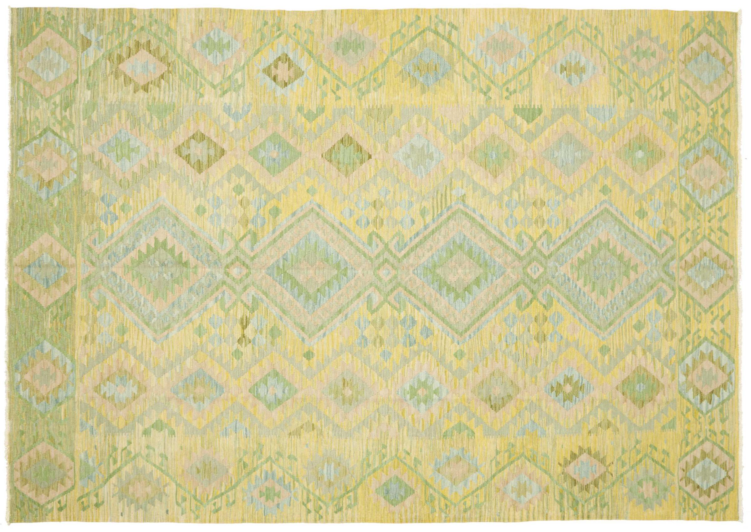 This rug was made as a flat weave by hand on a loom. Flatweave is the term used to describe rugs that have no pile. As the name promises, these rugs are woven and not knotted. This results in a flat rug with a structured surface. Flatweaves are not as soft and usually thinner than knotted rugs. At the same time they are much less complex to manufacture and can usually be laid out from both sides (front and back). Their patterns are usually geometric, which is determined by the fabric.