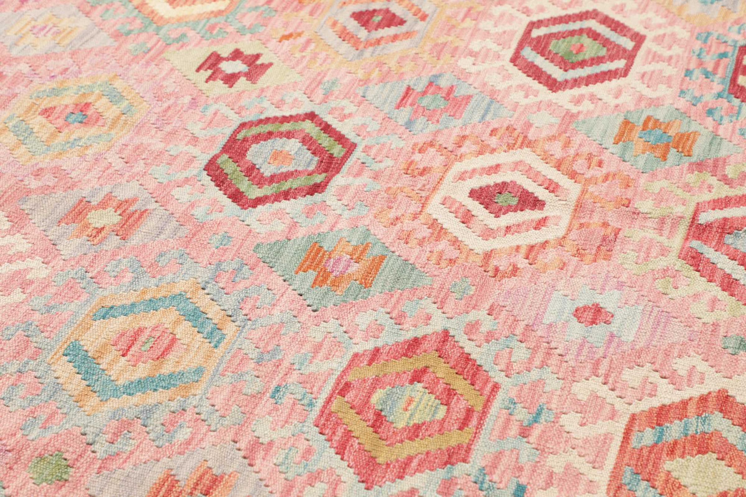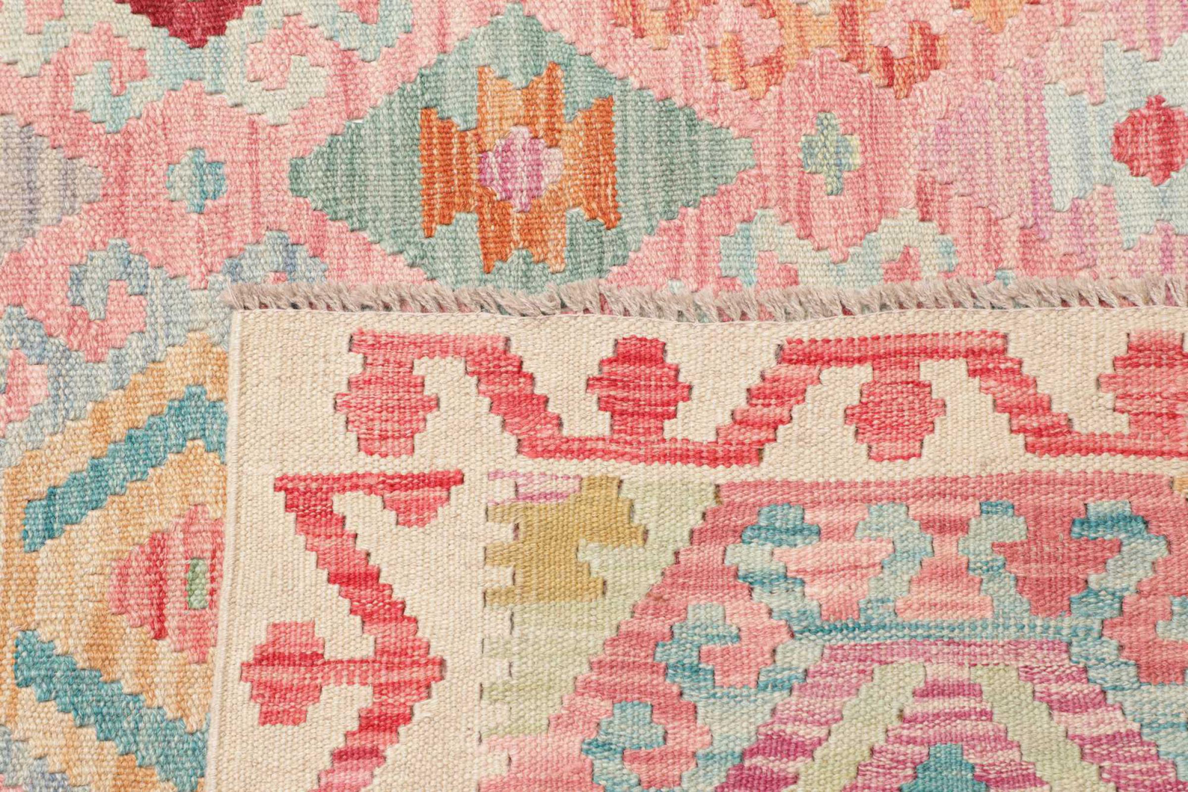 This Kilim Afghan rug has beautiful colors. It is handmade from fine wool. These patterns are traditional design elements that have already been used centuries ago. This particular kilim has been woven by hand in Afghanistan, a country with a long history in weaving and knotting rugs. The rug is robust and can be laid out on both sides.