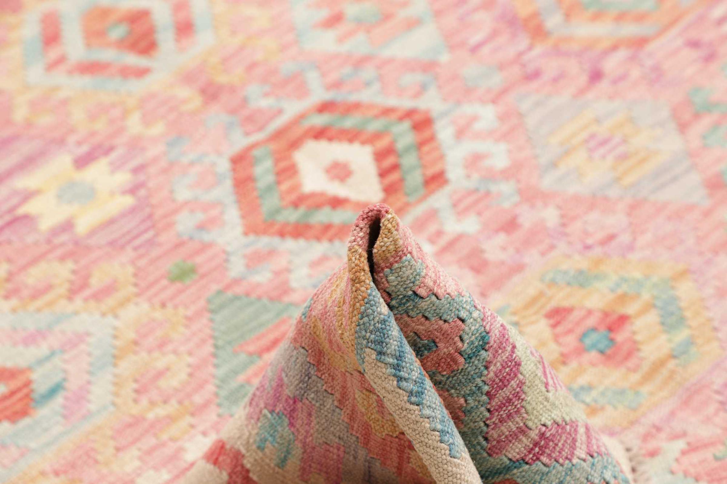 This rug was made as a flat weave by hand on a loom. Flatweave is the term used to describe rugs that have no pile. As the name promises, these rugs are woven and not knotted. This results in a flat rug with a structured surface. Flatweaves are not as soft and usually thinner than knotted rugs. At the same time they are much less complex to manufacture and can usually be laid out from both sides (front and back). Their patterns are usually geometric, which is determined by the fabric.