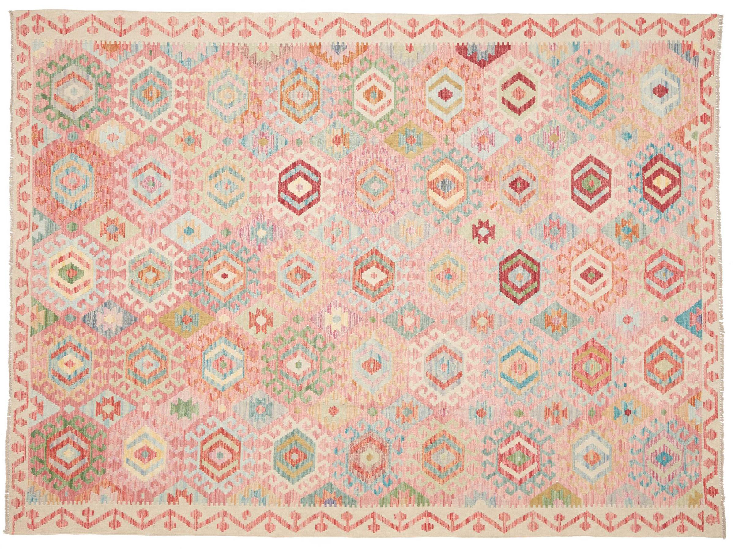 These Kilim rugs have a significant difference from hand-knotted rugs—they are handwoven. As a result, they do not have a high pile of wool and are often flatter and rougher than knotted wool rugs. Their construction is less intricate, making them generally much more affordable. Additionally, Kilim rugs are much lighter and can be laid out on either side. Handwoven Kilims originally come from what was once Persia and are now also widely produced in Afghanistan. They typically feature simple, straight-line patterns, which are characteristic of their weaving technique.