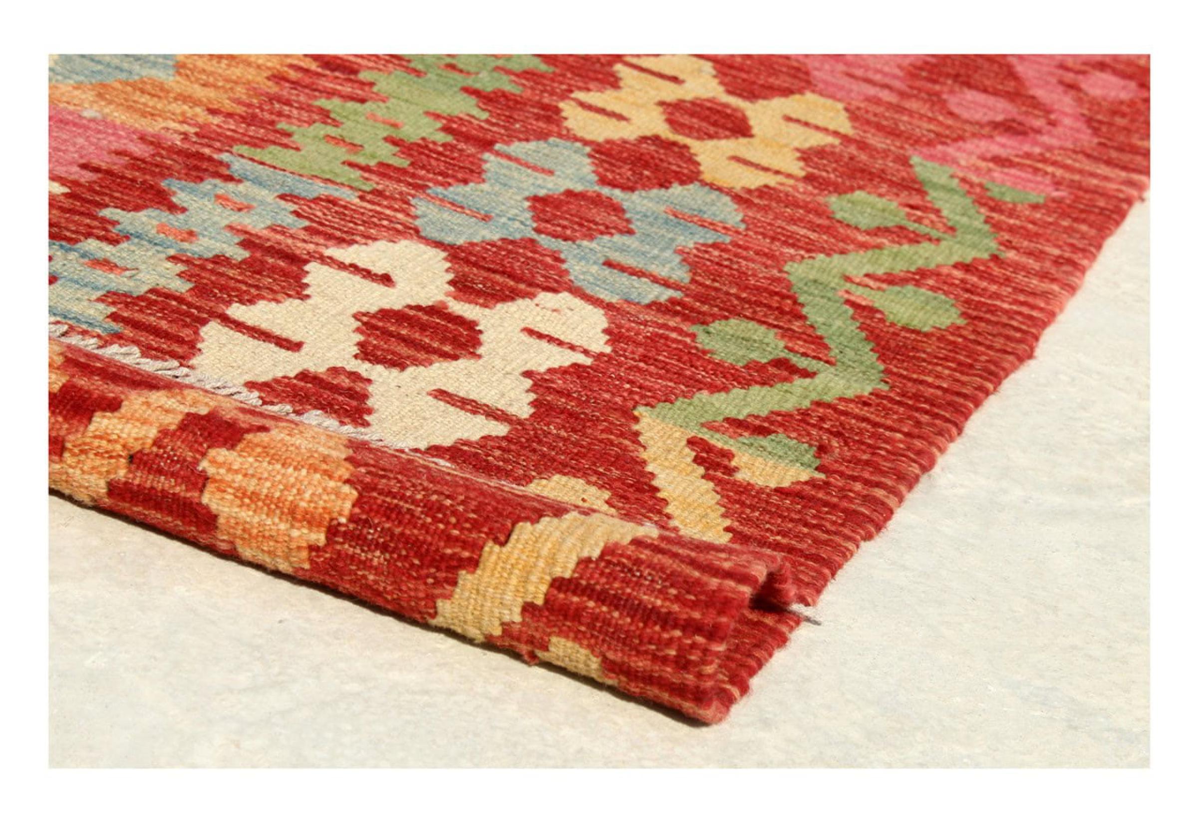 This Kilim Afghan rug has beautiful colors. It is handmade from fine wool. These patterns are traditional design elements that have already been used centuries ago. This particular kilim has been woven by hand in Afghanistan, a country with a long history in weaving and knotting rugs. The rug is robust and can be laid out on both sides.