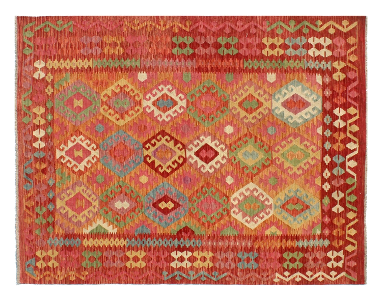 These Kilim rugs have a significant difference from hand-knotted rugs—they are handwoven. As a result, they do not have a high pile of wool and are often flatter and rougher than knotted wool rugs. Their construction is less intricate, making them generally much more affordable. Additionally, Kilim rugs are much lighter and can be laid out on either side. Handwoven Kilims originally come from what was once Persia and are now also widely produced in Afghanistan. They typically feature simple, straight-line patterns, which are characteristic of their weaving technique.