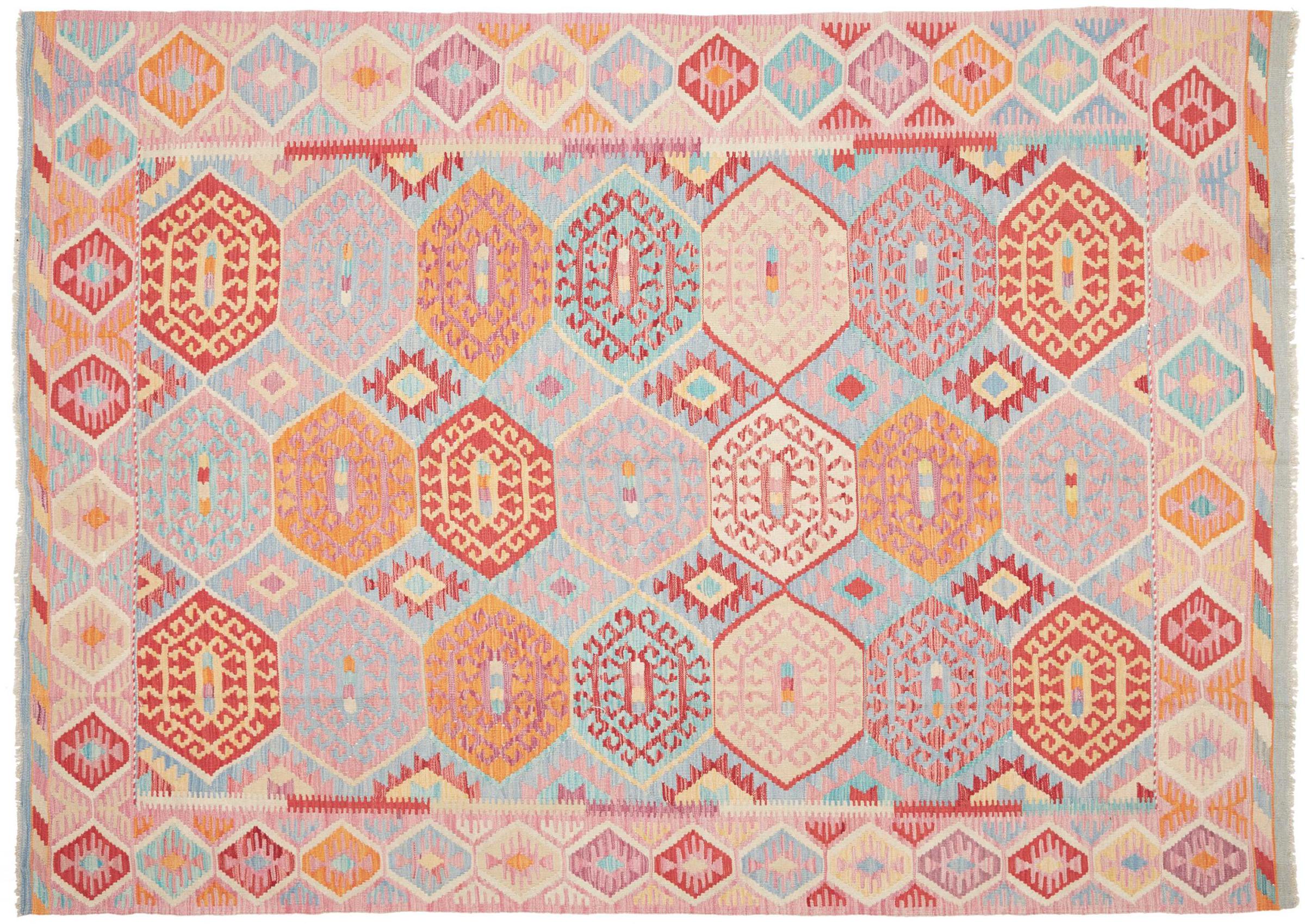 This Kilim Afghan rug has beautiful colors. It is handmade from fine wool. These patterns are traditional design elements that have already been used centuries ago. This particular kilim has been woven by hand in Afghanistan, a country with a long history in weaving and knotting rugs. The rug is robust and can be laid out on both sides.