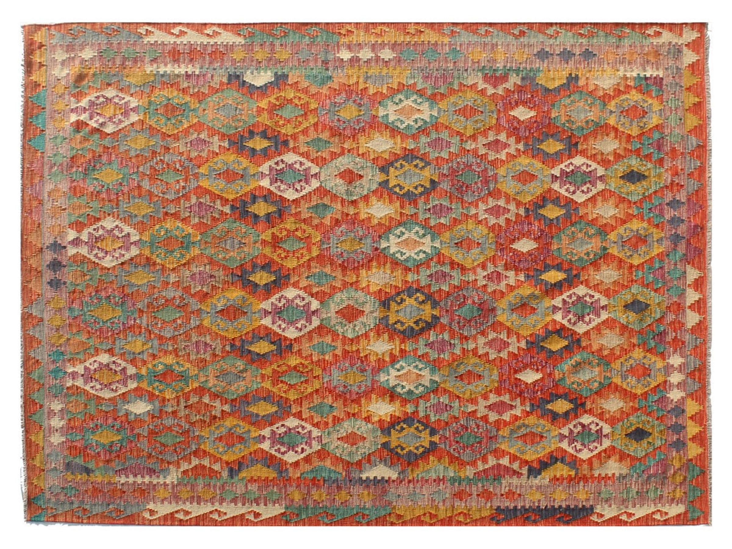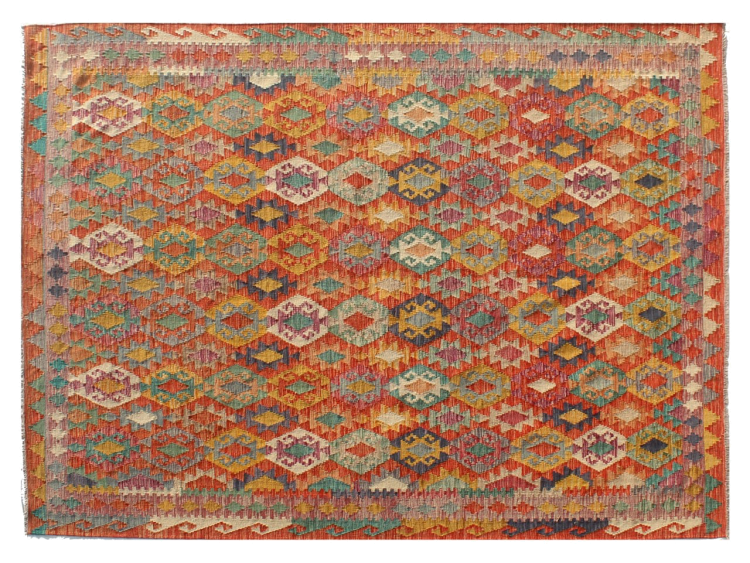 These Kilim rugs have a significant difference from hand-knotted rugs—they are handwoven. As a result, they do not have a high pile of wool and are often flatter and rougher than knotted wool rugs. Their construction is less intricate, making them generally much more affordable. Additionally, Kilim rugs are much lighter and can be laid out on either side. Handwoven Kilims originally come from what was once Persia and are now also widely produced in Afghanistan. They typically feature simple, straight-line patterns, which are characteristic of their weaving technique.