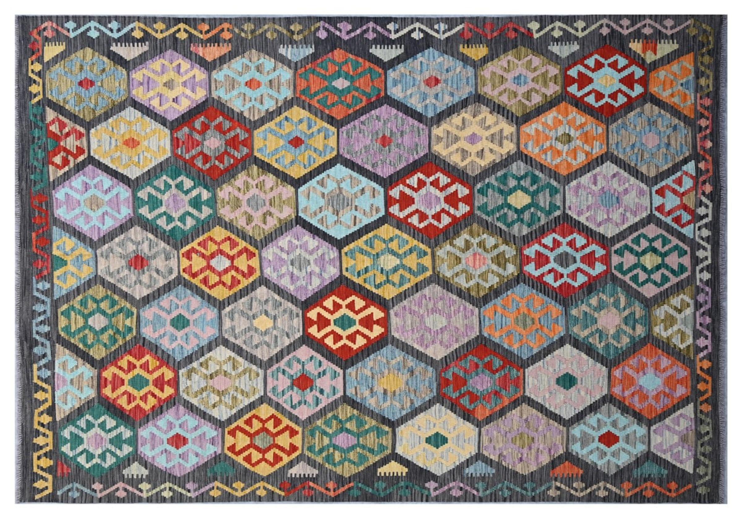 This Kilim Afghan rug has beautiful colors. It is handmade from fine wool. These patterns are traditional design elements that have already been used centuries ago. This particular kilim has been woven by hand in Afghanistan, a country with a long history in weaving and knotting rugs. The rug is robust and can be laid out on both sides.