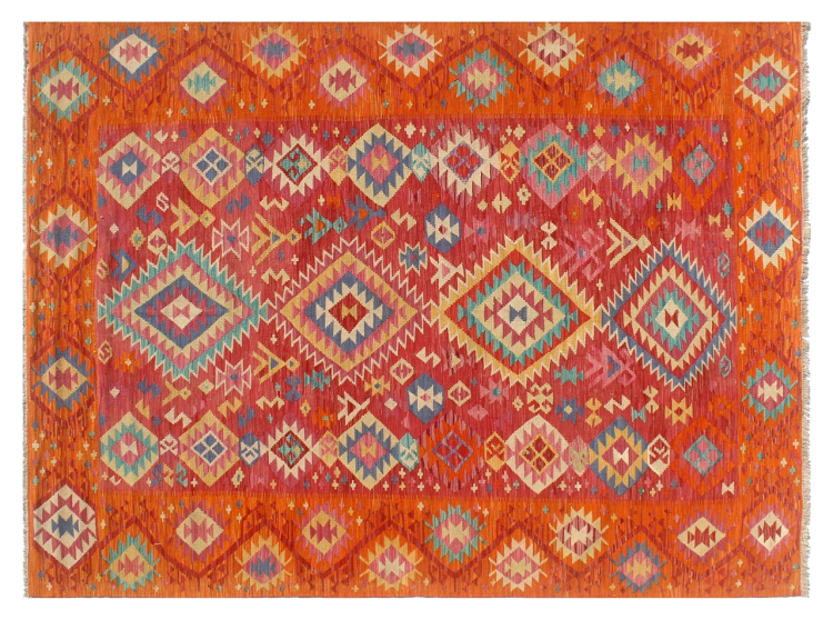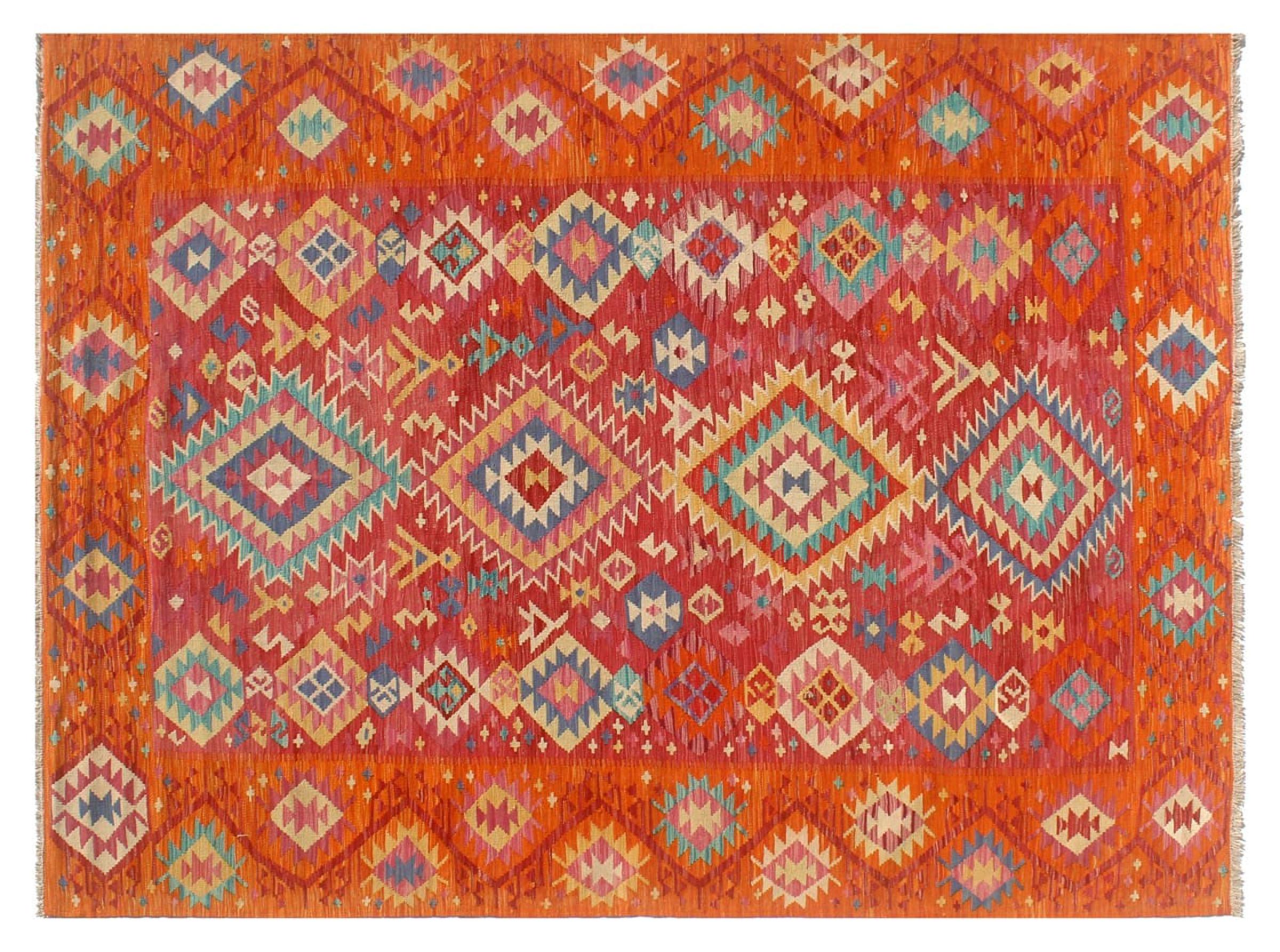 These Kilim rugs have a significant difference from hand-knotted rugs—they are handwoven. As a result, they do not have a high pile of wool and are often flatter and rougher than knotted wool rugs. Their construction is less intricate, making them generally much more affordable. Additionally, Kilim rugs are much lighter and can be laid out on either side. Handwoven Kilims originally come from what was once Persia and are now also widely produced in Afghanistan. They typically feature simple, straight-line patterns, which are characteristic of their weaving technique.