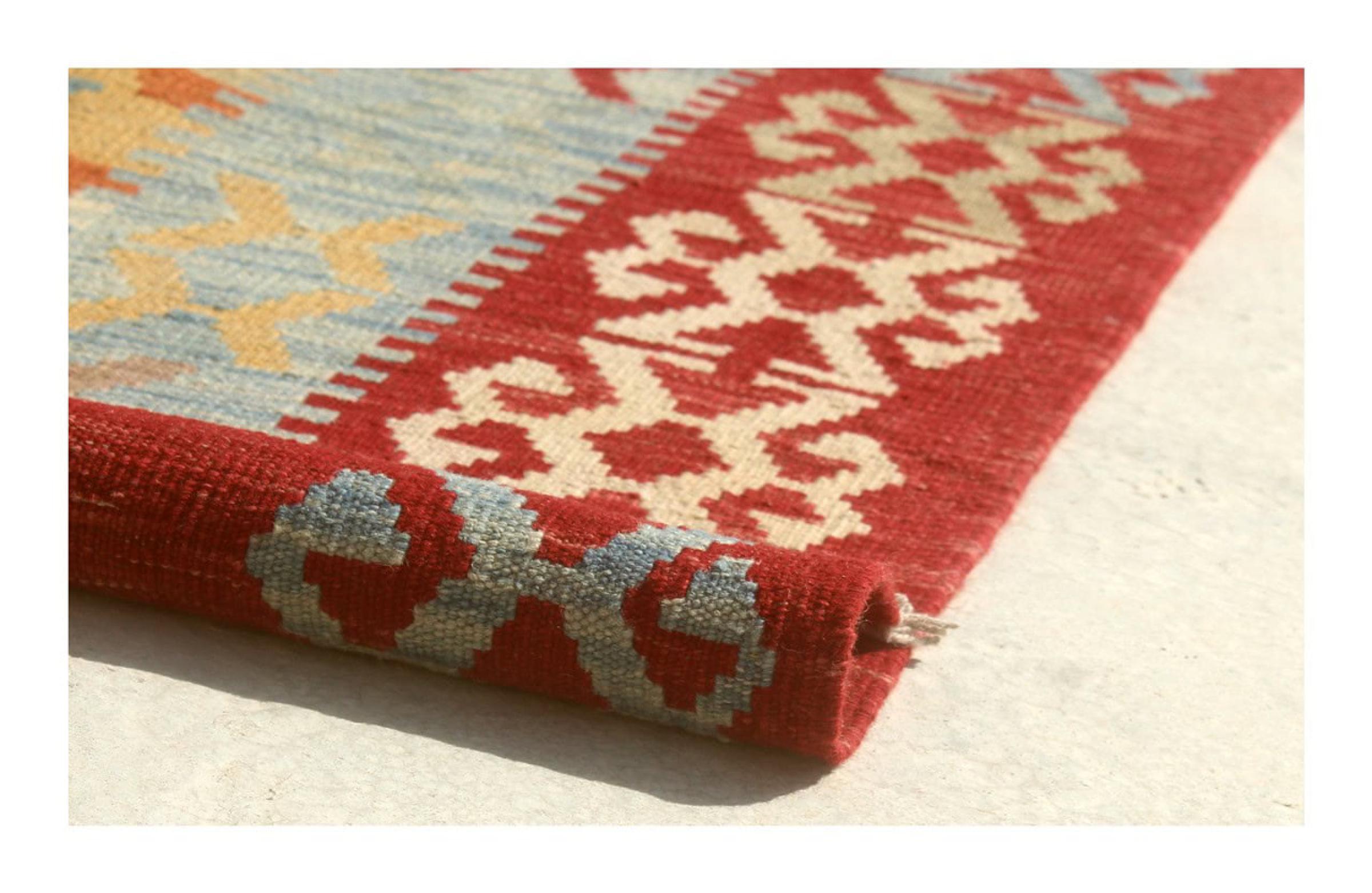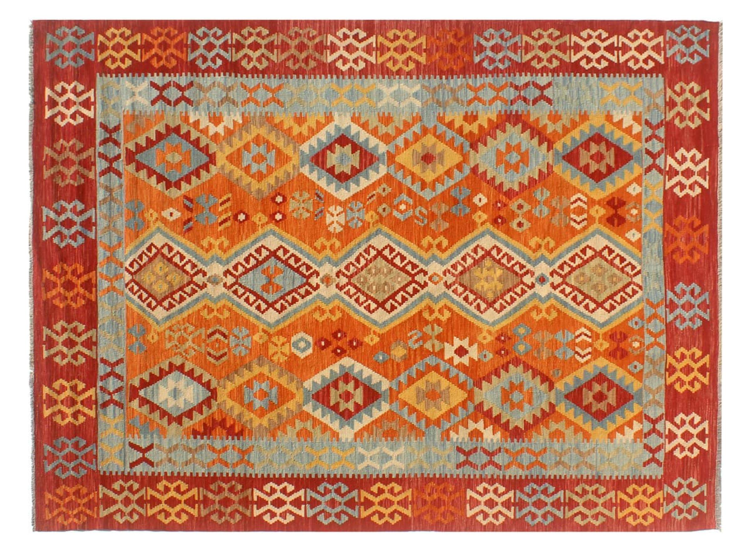 This Kilim Afghan rug has beautiful colors. It is handmade from fine wool. These patterns are traditional design elements that have already been used centuries ago. This particular kilim has been woven by hand in Afghanistan, a country with a long history in weaving and knotting rugs. The rug is robust and can be laid out on both sides.