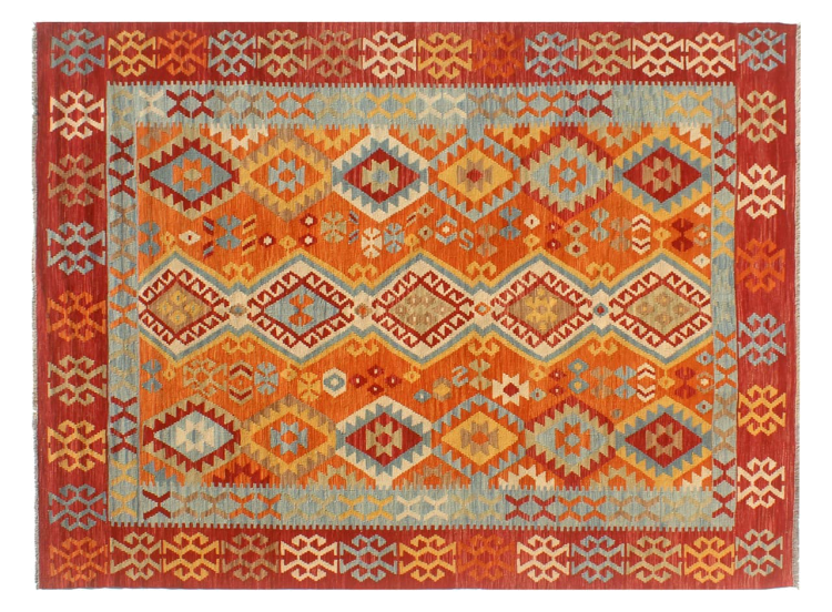 These Kilim rugs have a significant difference from hand-knotted rugs—they are handwoven. As a result, they do not have a high pile of wool and are often flatter and rougher than knotted wool rugs. Their construction is less intricate, making them generally much more affordable. Additionally, Kilim rugs are much lighter and can be laid out on either side. Handwoven Kilims originally come from what was once Persia and are now also widely produced in Afghanistan. They typically feature simple, straight-line patterns, which are characteristic of their weaving technique.