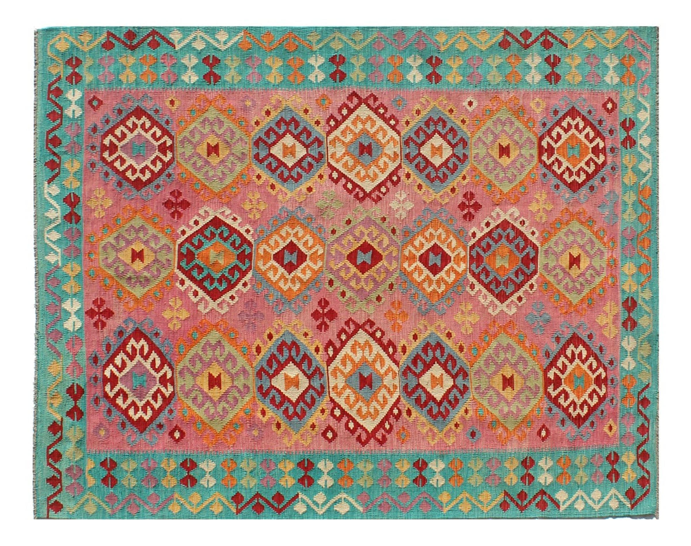 This Kilim Afghan rug has beautiful colors. It is handmade from fine wool. These patterns are traditional design elements that have already been used centuries ago. This particular kilim has been woven by hand in Afghanistan, a country with a long history in weaving and knotting rugs. The rug is robust and can be laid out on both sides.