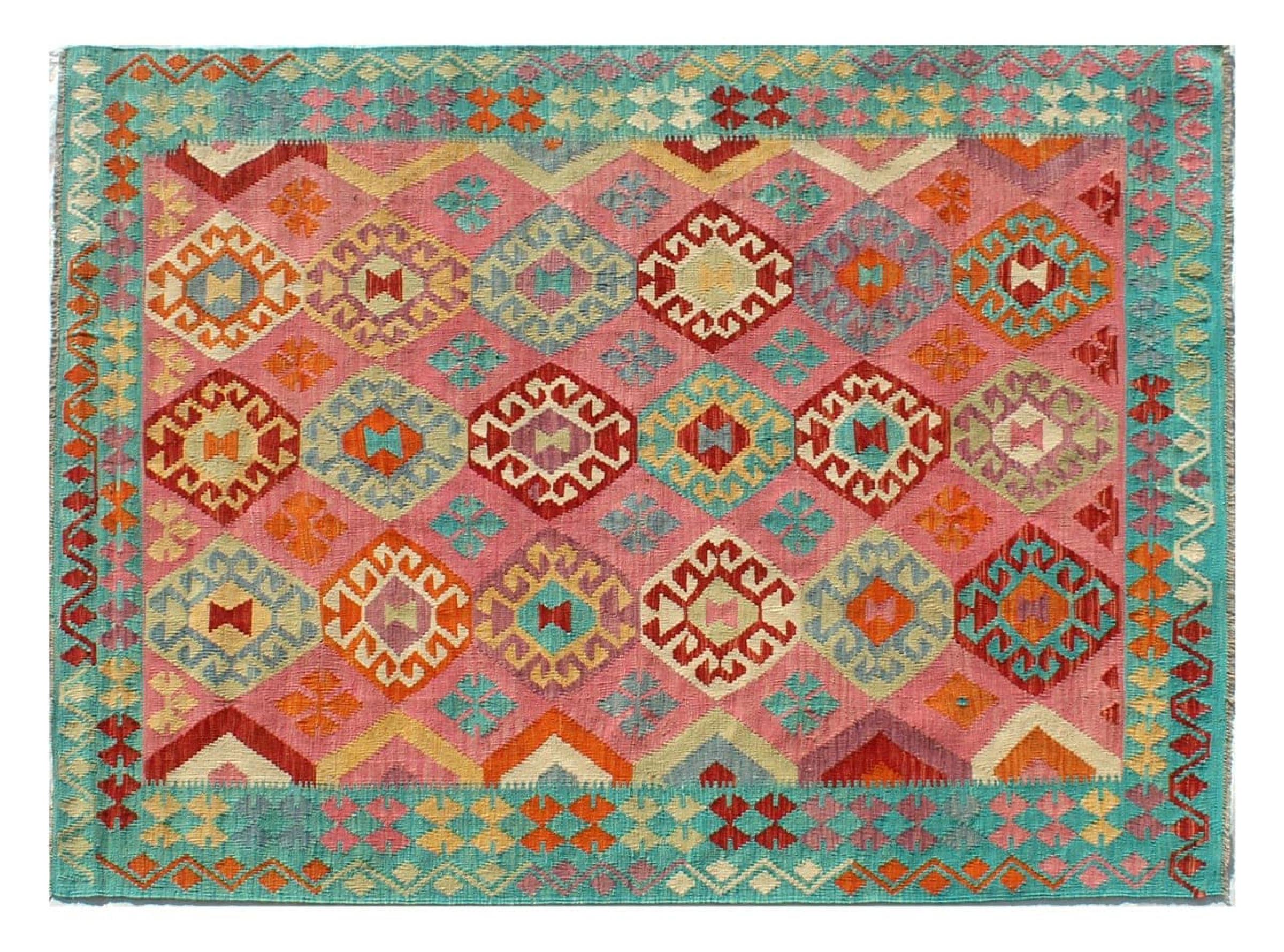 This Kilim Afghan rug has beautiful colors. It is handmade from fine wool. These patterns are traditional design elements that have already been used centuries ago. This particular kilim has been woven by hand in Afghanistan, a country with a long history in weaving and knotting rugs. The rug is robust and can be laid out on both sides.