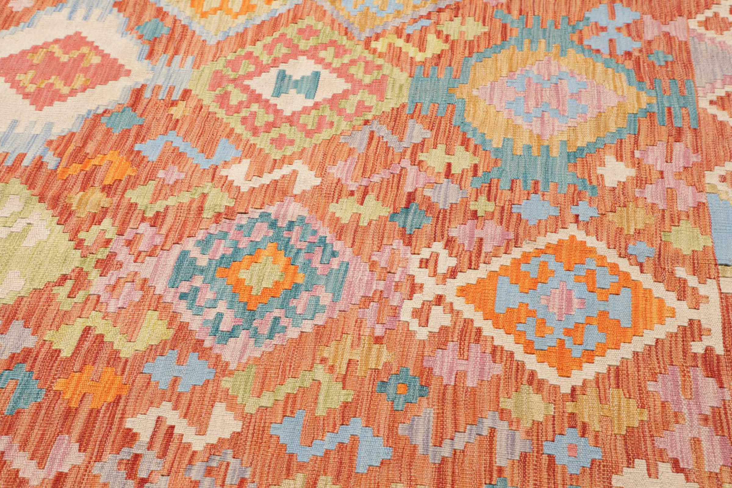 This Kilim Afghan rug has beautiful colors. It is handmade from fine wool. These patterns are traditional design elements that have already been used centuries ago. This particular kilim has been woven by hand in Afghanistan, a country with a long history in weaving and knotting rugs. The rug is robust and can be laid out on both sides.