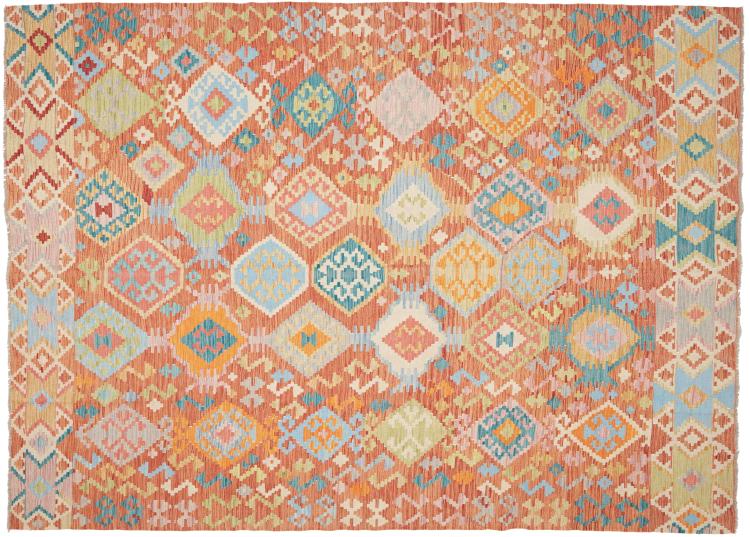These Kilim rugs have a significant difference from hand-knotted rugs—they are handwoven. As a result, they do not have a high pile of wool and are often flatter and rougher than knotted wool rugs. Their construction is less intricate, making them generally much more affordable. Additionally, Kilim rugs are much lighter and can be laid out on either side. Handwoven Kilims originally come from what was once Persia and are now also widely produced in Afghanistan. They typically feature simple, straight-line patterns, which are characteristic of their weaving technique.