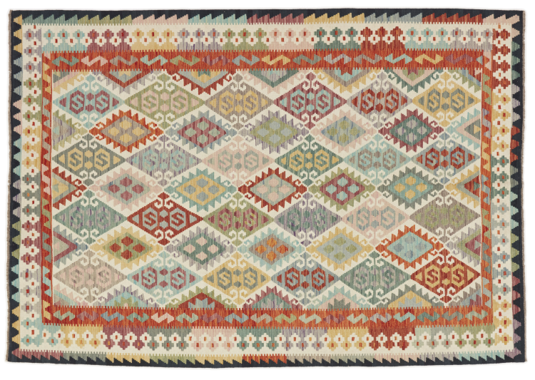 These Kilim rugs have a significant difference from hand-knotted rugs—they are handwoven. As a result, they do not have a high pile of wool and are often flatter and rougher than knotted wool rugs. Their construction is less intricate, making them generally much more affordable. Additionally, Kilim rugs are much lighter and can be laid out on either side. Handwoven Kilims originally come from what was once Persia and are now also widely produced in Afghanistan. They typically feature simple, straight-line patterns, which are characteristic of their weaving technique.